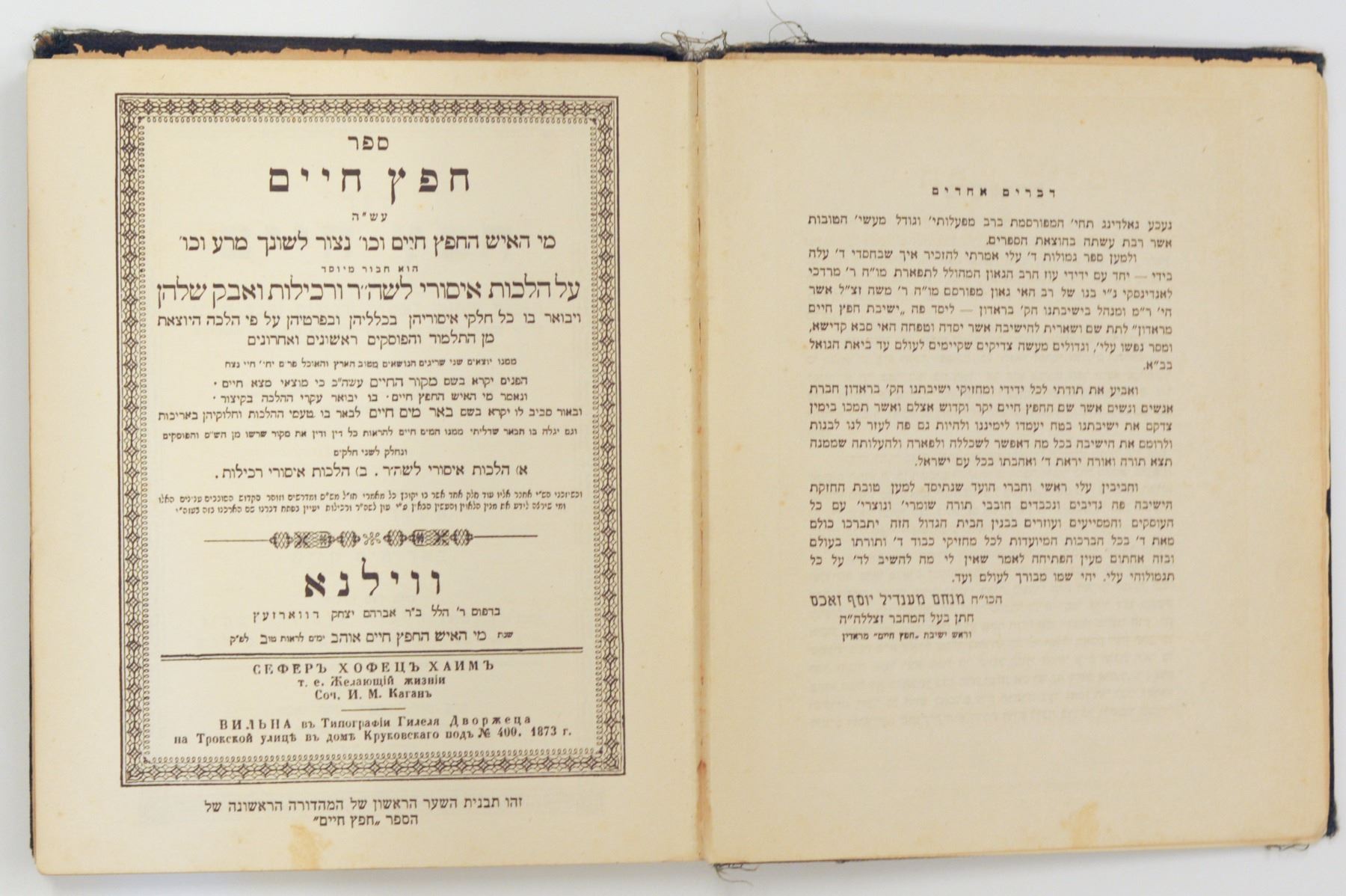 Chafetz Chaim, late edition, indecipherable rabbinic signature on title page, good condition: loose binding, damaged back cover, some foxing on endpapers.