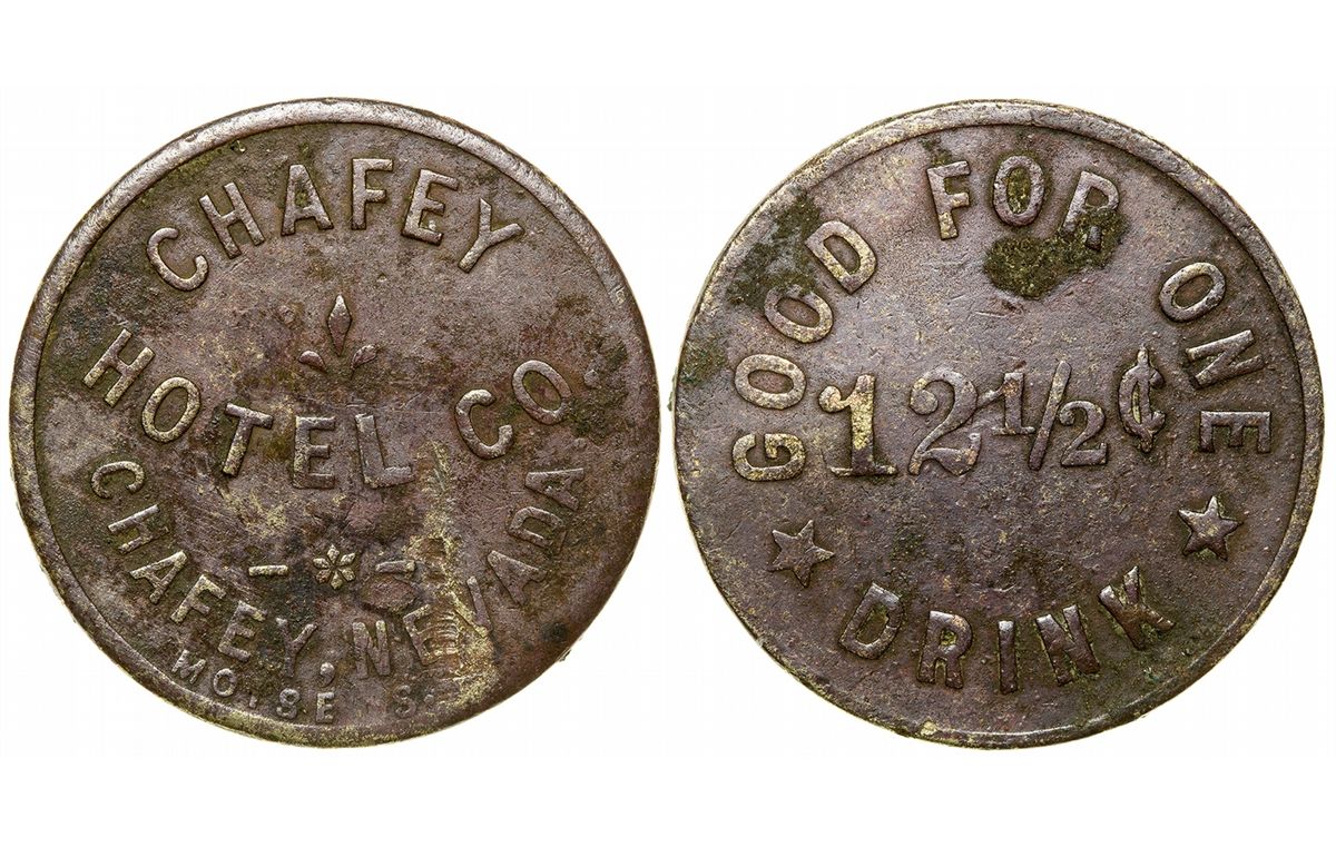 Chafey Hotel, Chafey, Nevada trade token. This is possibly the only known example. None photographed for the NTCA database. Found in Dun Glen in 1975 by our collector. This is a very rare town for the state, and this is the rarest of the three different tokens from Chafey. Chafey was originally called Dun Glen, renamed in 1908. Please see the photo of the town in Stan Paher's Nevada Ghost Town Book. - HKA#66344