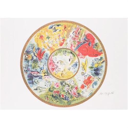 Notes:Five color lithograph, facsimile signature by Marc Chagall, printed on deckel edge heavy Teton paper. The print measures 25 x 35 inches. The edition size is 1500. The image is a detail of the Paris Opera Ceiling in Paris painted by Chagall. Very bright colors, beautiful center piece for any room.
