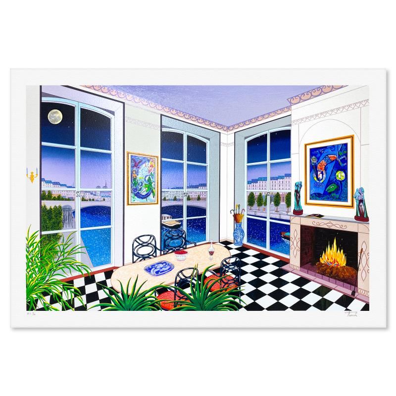 "Chagall in Paris" is a limited edition serigraph on paper by Fanch, HC numbered 1/10 and hand signed by the artist. Includes Letter of Authenticity. Measures approx. 23.5" x 33.5" (border), 20.5" x 30.5" (image). This proof came from Fanch Ledan's personal collection. It may have some slight imperfections in the image and border, but it's overall condition was inspected and approved by him.