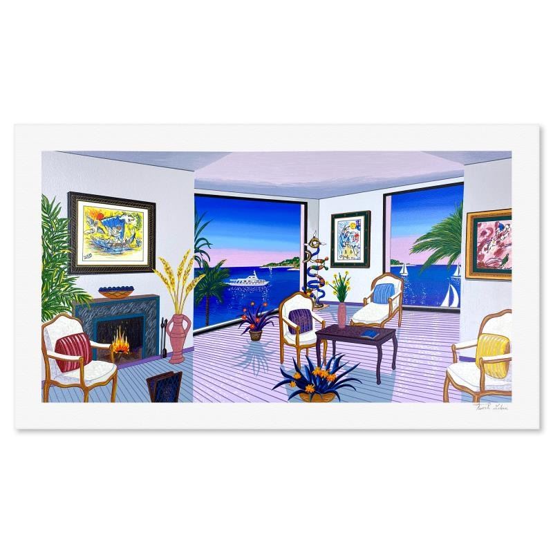 "Chagall in the South" is a limited edition serigraph on paper by Fanch, numbered and hand signed by the artist. Includes Letter of Authenticity. Measures approx. 17.5" x 31.5" (border), 14" x 28" (image). There are minor imperfections in the white border area.