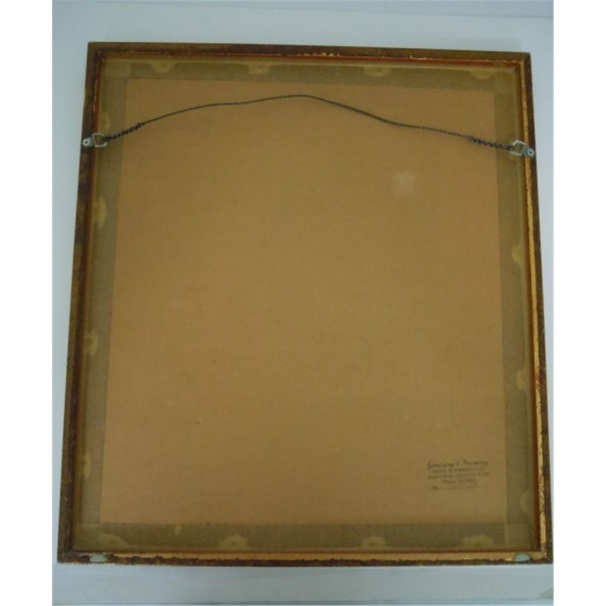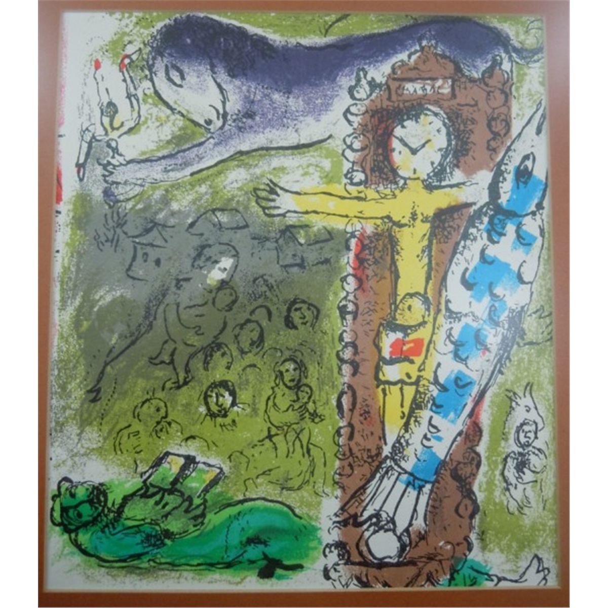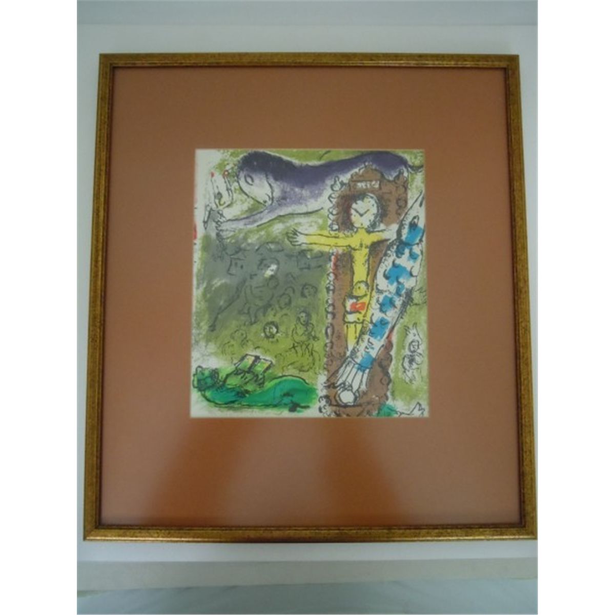This lithograph is Marc Chagall's 1957 work. He plays on symbolic imagery. The print is framed in a 16" x 14" speckled gold-colored sealed frame. The print measures 9" x 8". Chagall was a Russian-French artist associated with several major artistic styles, and one of the most successful artists of the 20th century. He was an early Modernist, who created works in virtually every artistic medium including painting, book illustrations, stained glass, stage sets, ceramic, tapestries and fine art prints.
