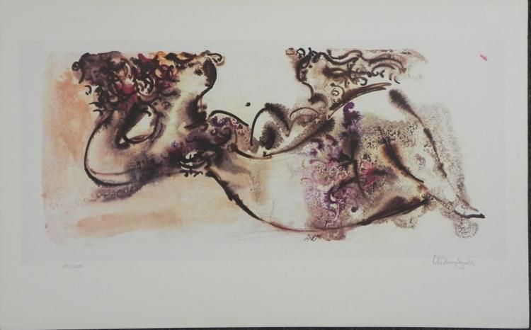 Artist: Chaim GrossTitle: Reclining Nude * Medium: Litho print on * paperSignature: Signed by artist, lower * rightEdition: 23/250, lower * leftImage size: 13" x * 28 1/4" * Sheet size: 19 1/4" x * 31" * Condition: Excellent * Biography * Chaim * Gross is considered among * one of the greatest of Twentieth Century figurative * sculptors, * and his graphic work is also highly celebrated. A * native of * Austria, Chaim Gross emigrated to the United States in * 1921 * where he began studies with Robert Laurent and Elie * Nadelman. * His works can be seen in every major American museum * collection * and at The Chaim Gross Studio Museum in New York. * * Well known for his direct wood * carvings of circus performers, * animals and the female form, Chaim Gross worked in a * combination * of traditional and tribal/folk styles. Gross began to * focus * heavily on his heritage and Judaic themes after the * terrible * events of World War II. * * Today, it is clear that his interest in the * human form was * used to create more than simple sculpture. Every * curvature and * graceful stroke helped ensure that the viewer was and * will continue * to be awed with his unique style. By simplifying and * omitting * details, his sculpture is a celebration of joy, love * and humanity. * *Retrieved from: * http://www.rogallery.com/Gross_Chaim/gross_c_bio.htm * * * * * * * *