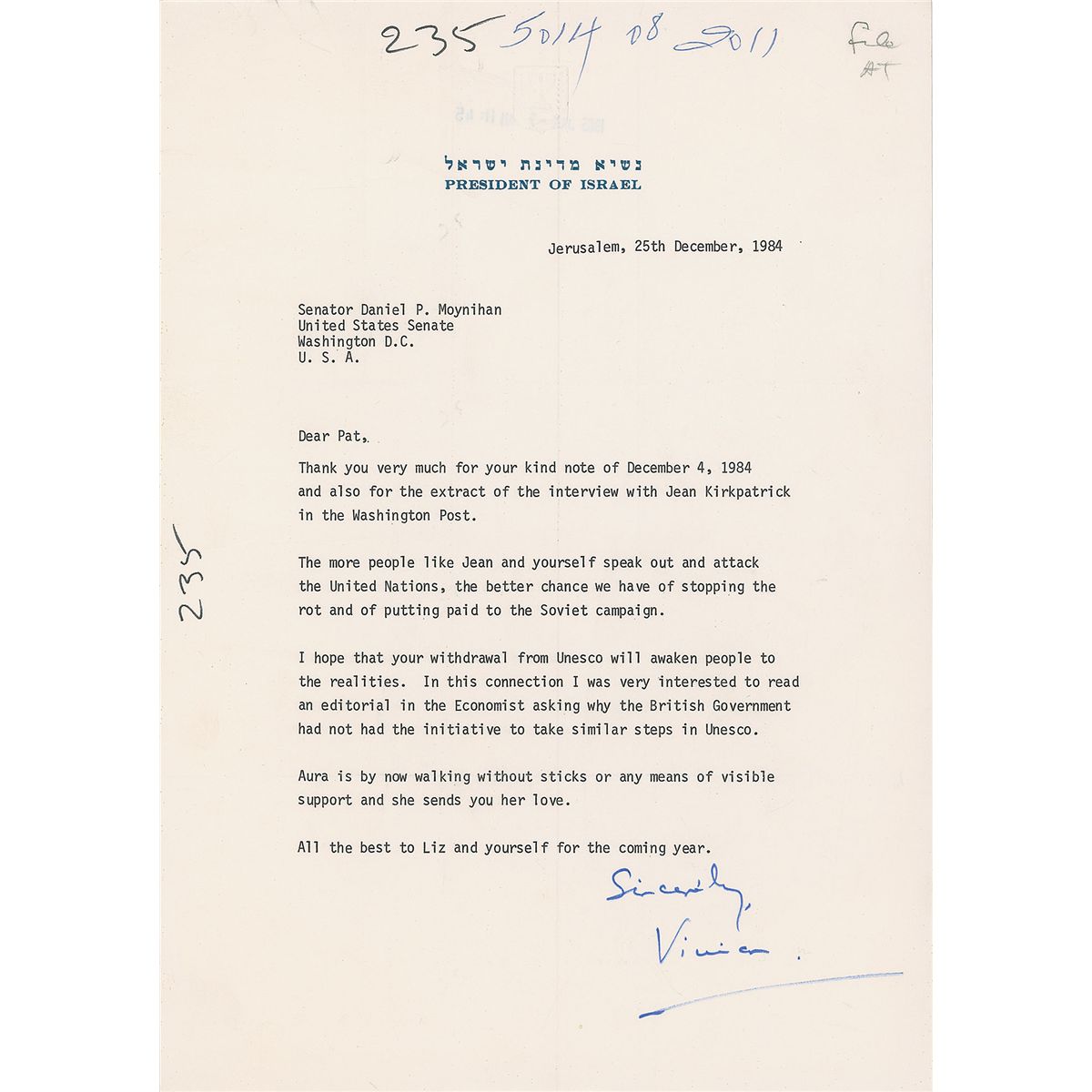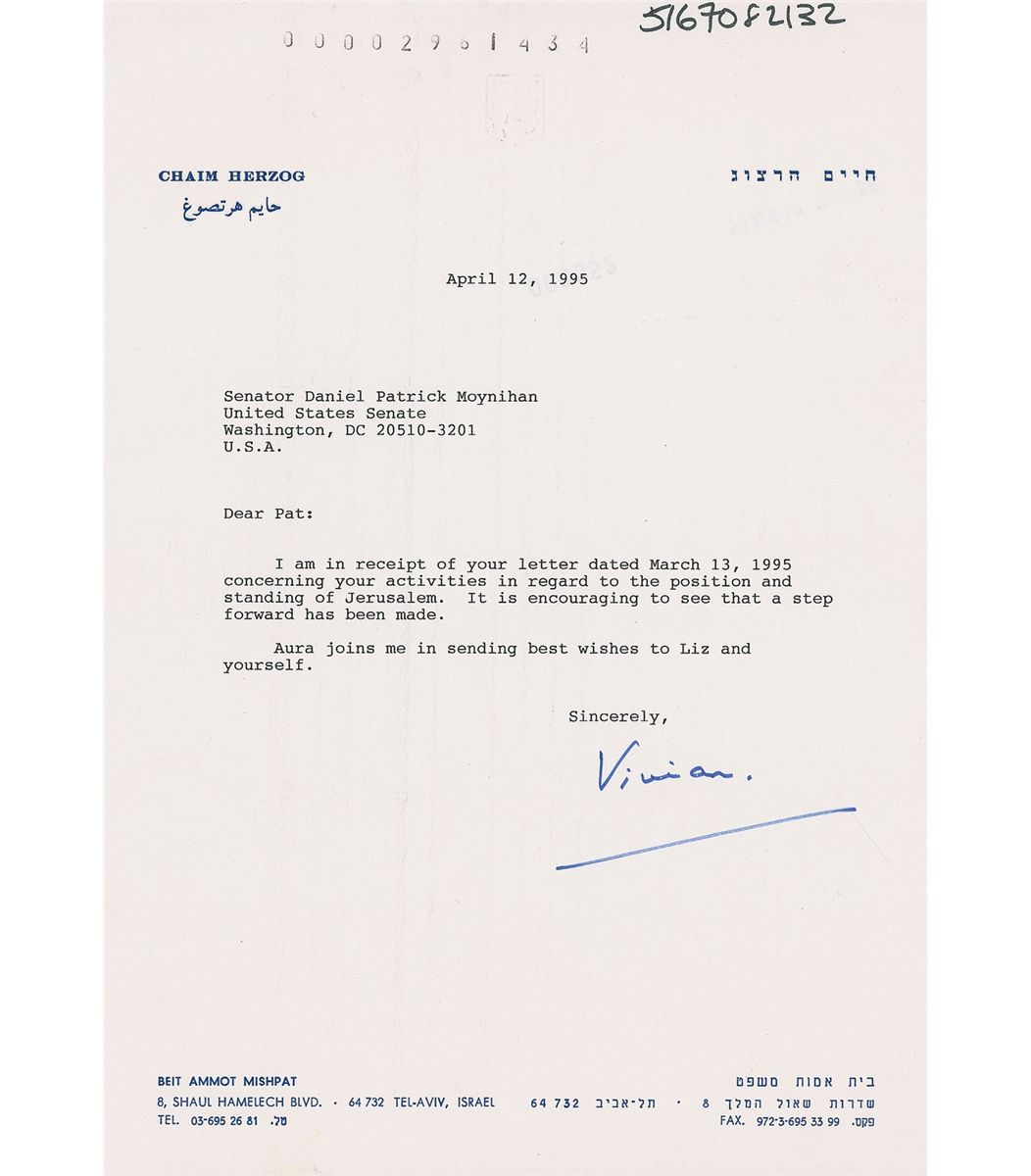 Irish-born Israeli politician who served as president from 1983–1993. A staunch defender of Israeli security, he established his political reputation as a military intelligence leader during the Six-Day War (1967). Two TLSs, both signed “Vivian,” from Herzog to Senator Daniel P. Moynihan, both one page, 8.25 x 11.5, dated 1984 and 1995. The letter from 1984 reads, in part: “The more people like Jean [Kirkpatrick] and yourself speak out and attack the United Nations, the better chance we have of stopping the rot and of putting paid to the Soviet campaign. I hope that your withdrawal from Unesco will awaken people to the realities. In this connection I was very interested to read an editorial in the Economist asking why the British Government had not had the initiative to take similar steps in Unesco.” In fine condition, with some office stamps and notations to edges.