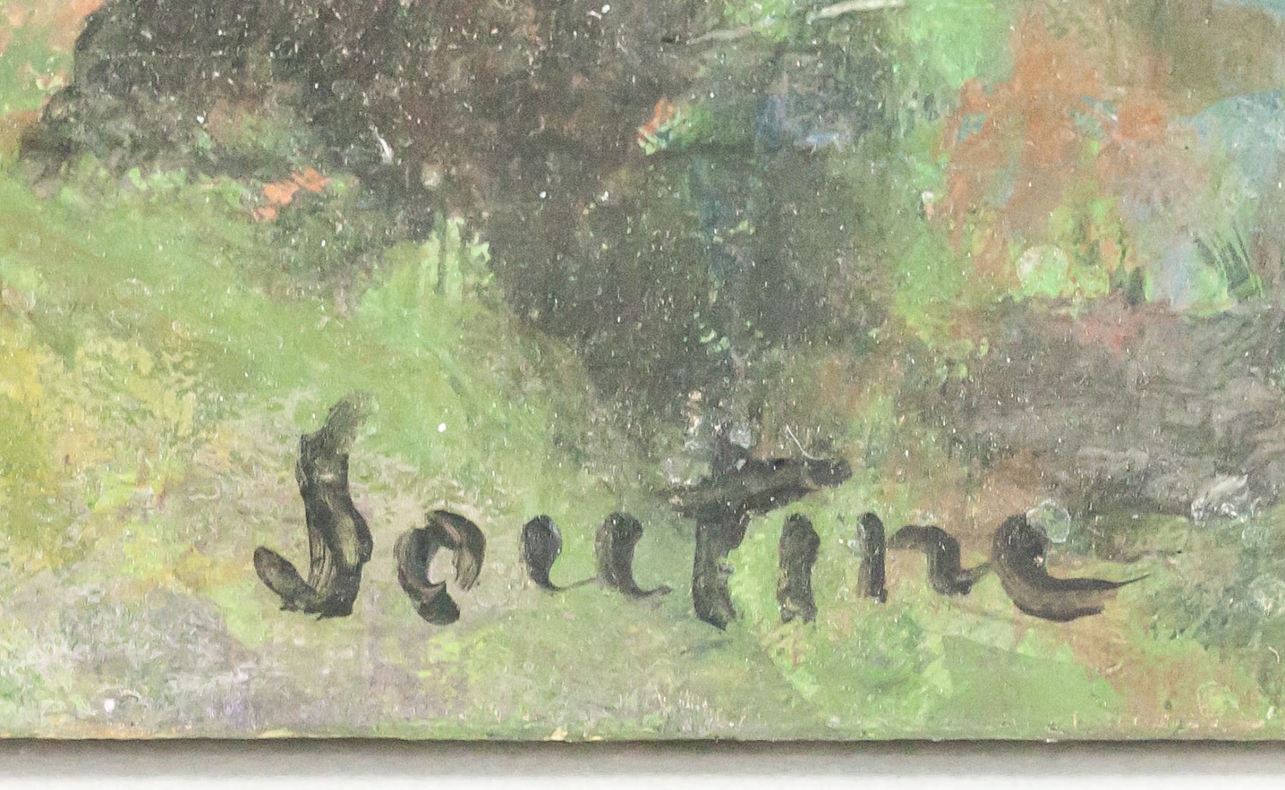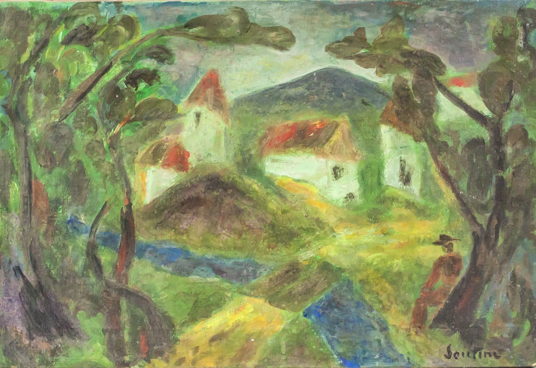 Oil on canvas. Featuring landscape scene with red-roofed houses in the background and a figure sitting by a tree. Signed "Soutine" in the bottom right corner. Attributed to Chaim Soutine (1893-1943, Russian-French). 34 x 50 cm (13.5 x 19.5 inches). Provenance: This lot carries limited provenance from a Southern Ontario estate