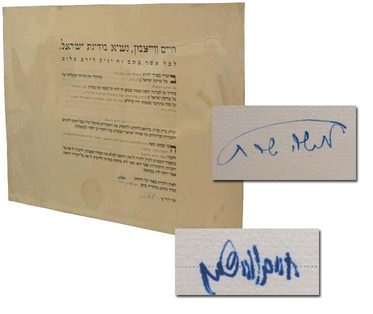 Document signed ''Chaim Weizmann'' as first President of Israel and ''Moshe Sharett'' as first Foreign Minister. Dated 17 May 1950 from Hakirya, document appoints Chaim Raphael as Deputy Consul of Israel in London. In part, ''His jurisdiction will include the entire United Kingdom and Northern Ireland…I hereby request King George the Sixth, and all the authorities with an interest in the matter, to recognize Mr. Chaim Raphael in his declared office, and allow him the freedom to fulfill his role in confidence, to grant him all the rights and immunities her is entitled to by his office and grant him all the assistance and protection he may need…'' Issued in Hakirya instead of Jerusalem as Israel's capital was under the siege of war during this time. A career diplomat, Chaim Raphael later served in Australia and Southeast Asia, and as Israel’s Ambassador to Congo, Madagascar and Mauritius. Official embossed 2.5'' diameter paper seal affixed near lower edge and embossed with the seal of the State of Israel at top center. With some tears and soiling in blank areas at perimeter, which framing would conceal. Single page measures 25'' x 17''.