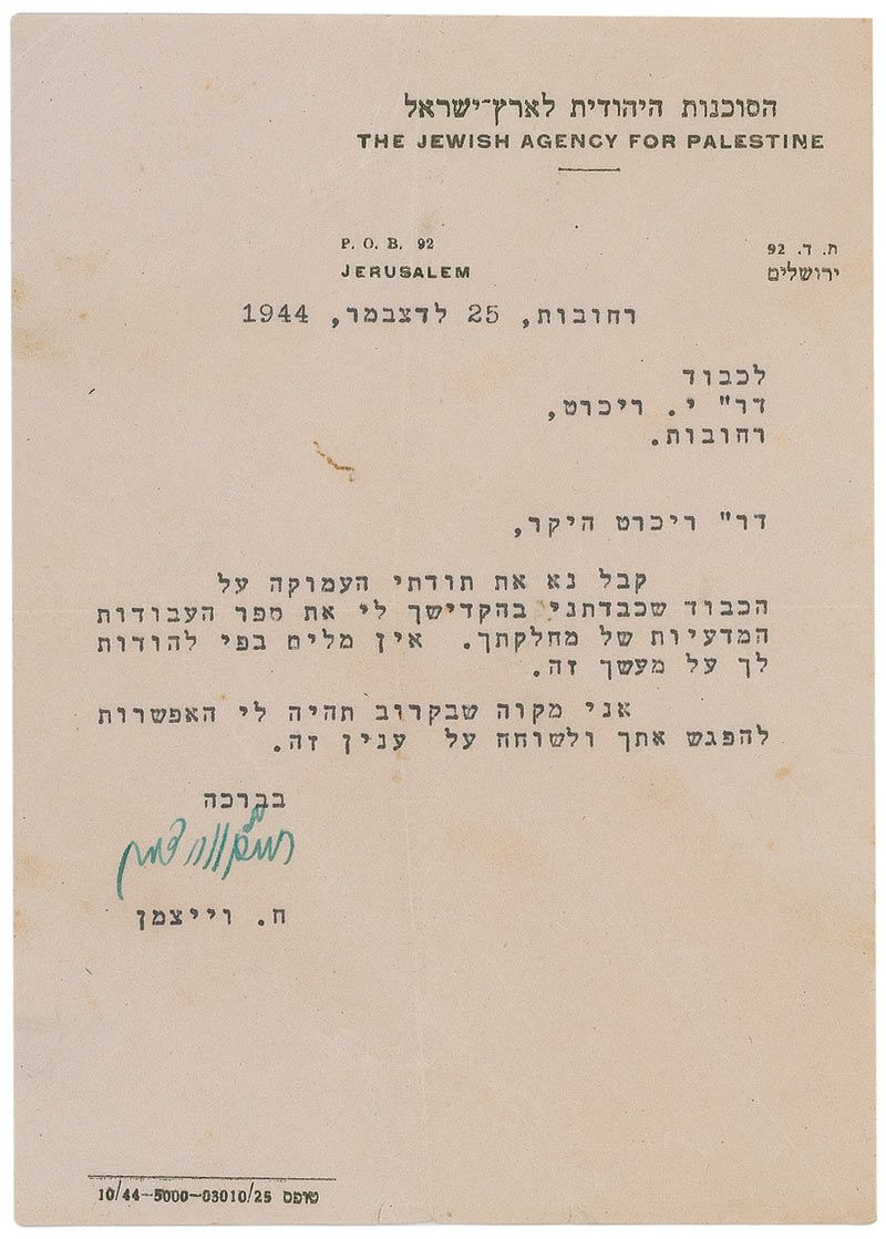 Jewish chemist and statesman (1874–1952) who helped secure the Balfour Declaration of 1917, served as President of the World Zionist Organization, and became the first President of Israel. TLS in Hebrew, one page, 5 x 6.75, Jewish Agency for Palestine letterhead, December 25, 1944. Letter, written as President of the World Zionist Organization, reads, in part (translated): “Accept my deepest thank you for the honor that you bestowed on me in your dedication to me the book of your department's scientific work.” Central horizontal and vertical fold and some scattered light creasing and toning, otherwise fine condition.