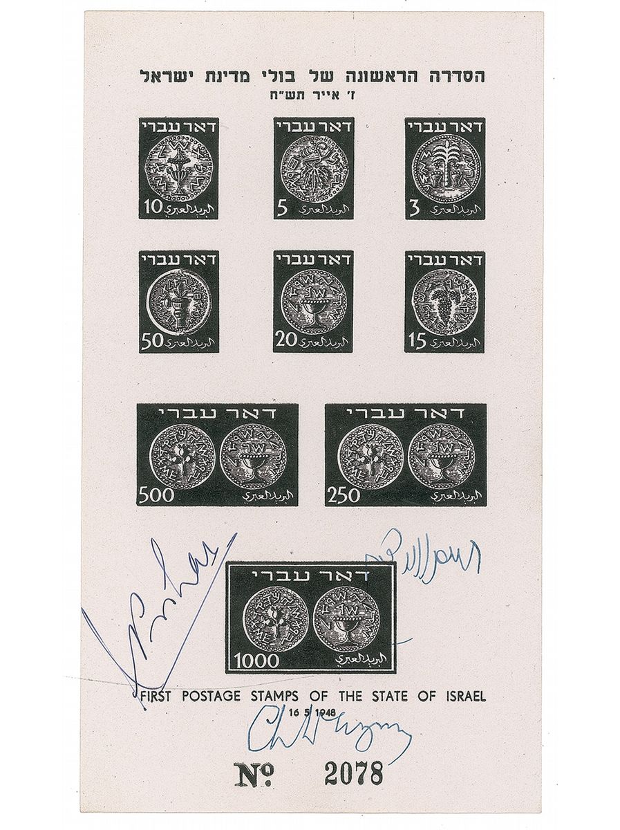 Jewish chemist and statesman (1874–1952) who helped secure the Balfour Declaration of 1917, served as President of the World Zionist Organization, and became the first President of Israel. Philatelic souvenir displaying printed examples of Israel’s first postage stamps from 1948, 3.75 x 6.75, No. 2078, signed in blue ink by Weizmann in both Hebrew and English, and also signed by Zvi Prihar. In fine condition.