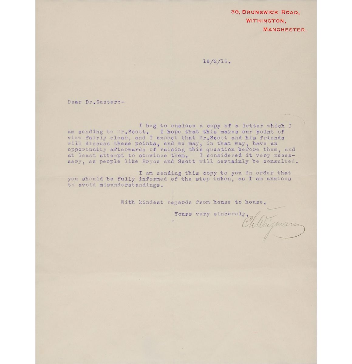 LS signed “Ch. Weizmann,” one page, 8 x 10.25, personal letterhead, February 16, 1915. Letter to Dr. Gaster, in part: “I hope that this makes our point of view fairly clear, and I expect that Mr. Scott and his friends will discuss these points, and we may, in that way, have an opportunity afterwards of raising this question before them, and at least attempt to convince them. I considered it very necessary, as people like Bryce and Scott will certainly be consulted. I am sending this copy to you in order that you should be fully informed of the step taken, as I am anxious to avoid misunderstandings.” In fine condition, with intersecting folds and trivial creasing. Along with Weizmann, the Jewish-British scholar Moses Gaster was a prominent leader of the Zionist movement, serving as vice president of the First Zionist Congress in Basel and actively participating in each succeeding congress. This letter provides a unique insight into the budding relationship of Weizmann and Gaster, whose ‘Mizpah’ residence in London would serve as the venue for the first draft of the Balfour Declaration.