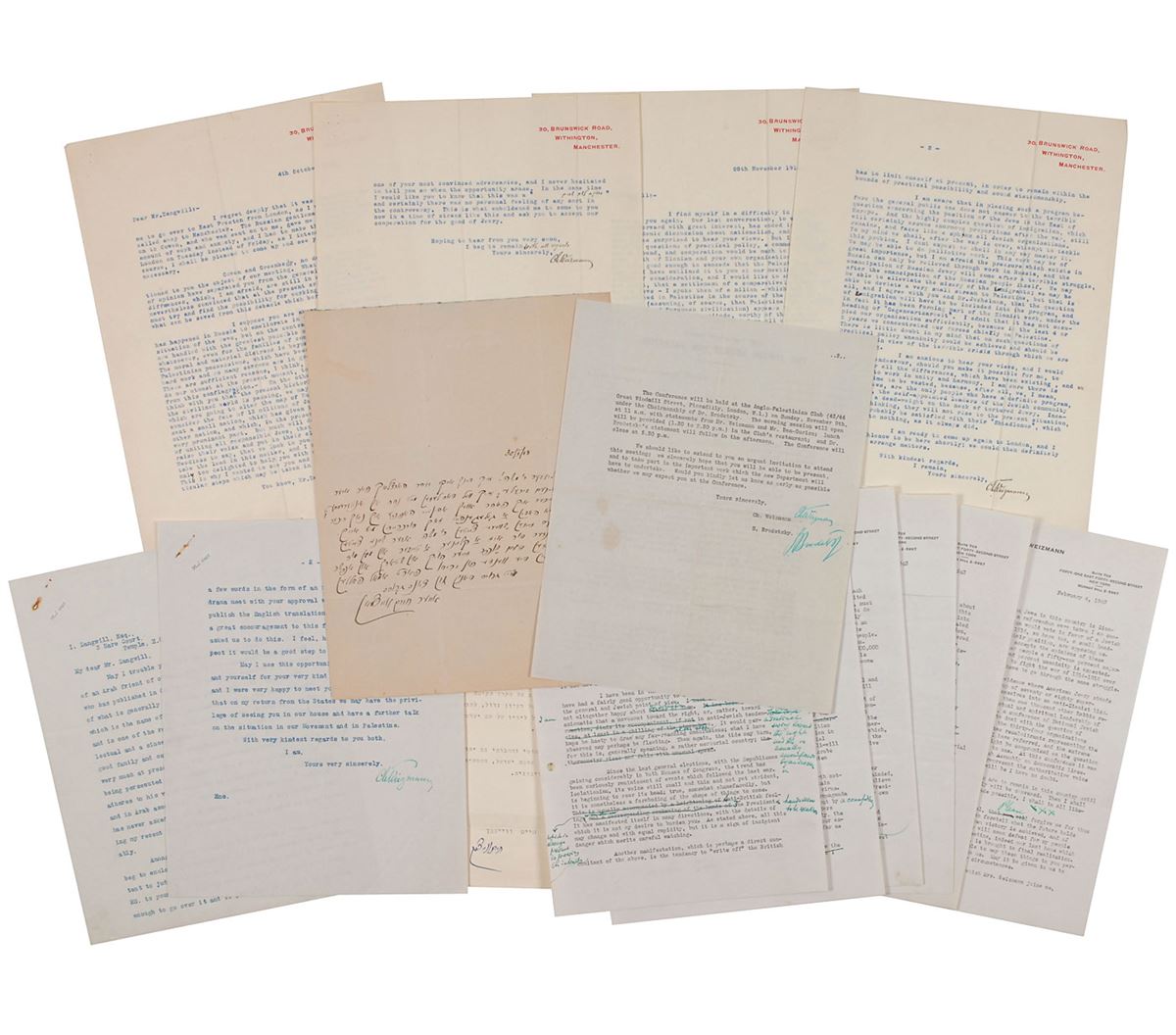 Jewish chemist and statesman (1874–1952) who helped secure the Balfour Declaration of 1917, served as President of the World Zionist Organization, and became the first President of Israel. Archive of eight items consisting of seven letters in English and Hebrew (including one ALS) and one typed proclamation, ranging in date from 1914 to 1951 and totaling 20 pages on 19 sheets. Five are signed and one is hand-notated. The letters are written to notable figures Field Marshall Jan Christian Smuts, Moshe Sharett, Walter Ettinghausen, and Israel Zangwill, and are incredibly rich in content, including thoughts of Europe after World War I, the settlement of Jews in Palestine, and secret questions about the congress of Zionists and about the “advancement of our aims in Palestine.” Two letters to Zangwill are unsigned: one is a retained carbon copy and one is a two-page TLS bearing a stamped signature. The six-page letter to Smuts is also unsigned, but is heavily notated in Weizmann's hand. A selection of the letters follows: