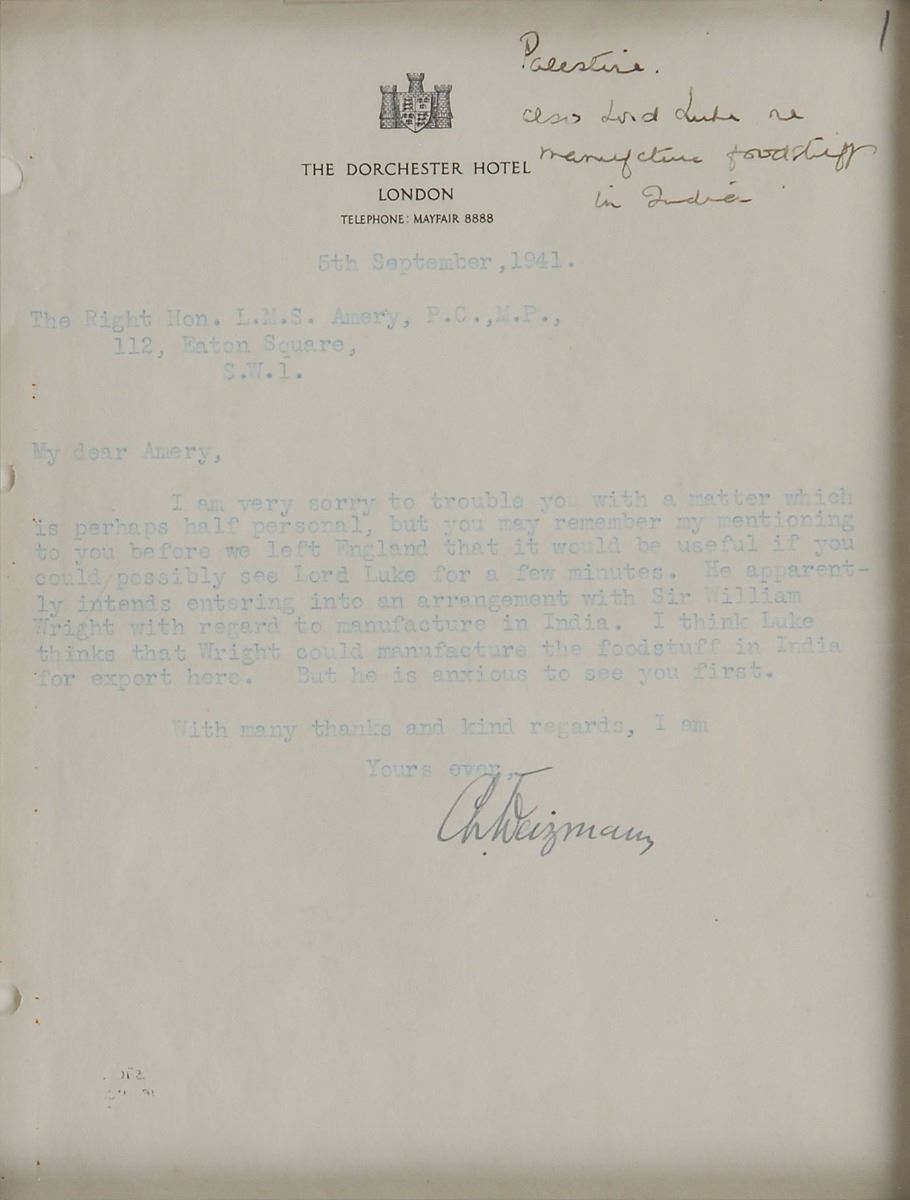 TLS signed “Ch. Weizmann,” one page, 5.5 x 7, The Dorchester Hotel letterhead, September 5, 1941. Letter to the Right Hon. L.M.S. Amery, in part: “You may remember my mentioning to you before we left England that it would be useful if you could possibly see Lord Luke for a few minutes. He apparently intends entering into an arrangement with Sir William Wright with regard to manufacture in India. I think Luke thinks that Wright could manufacture the foodstuff in India for export here. But he is anxious to see you first.” A notation in another hand at the top reads, “Palestine. Also Lord Luke re manufacture foodstuff in India.” Handsomely double-matted and framed with a portrait and plaque. In fine condition.
