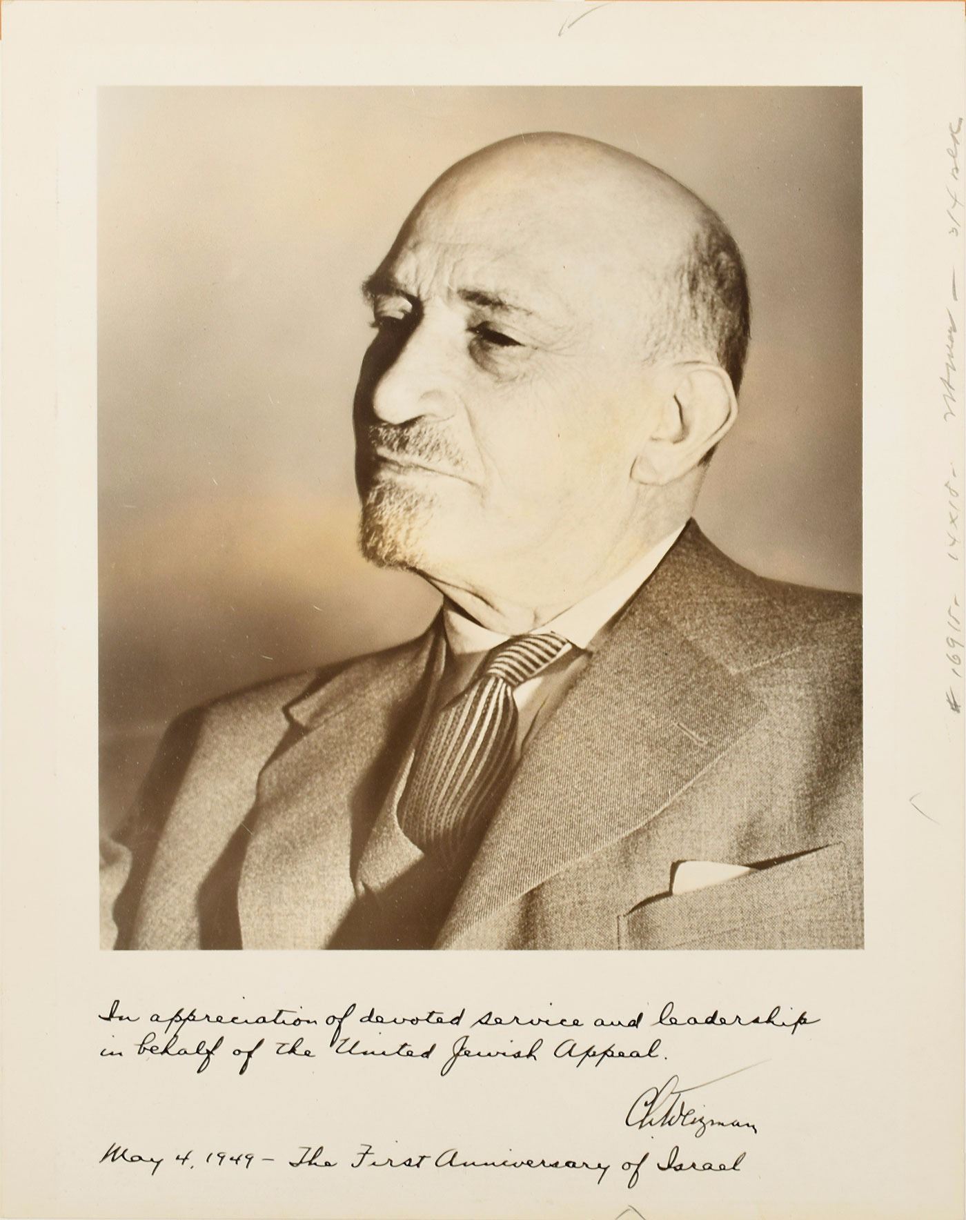 Vintage matte-finish 11 x 14 portrait of the renowned chemist and Zionist leader, signed "Ch. Weizmann" in black ink, with "In appreciation of devoted service and leadership in behalf of the United Jewish Appeal" and "May 4, 1949—The First Anniversary of Israel" added in another hand. Affixed to an off-white 16 x 19.75 sheet of foamcore. In fine condition. Accompanied by a full letter of authenticity from JSA.