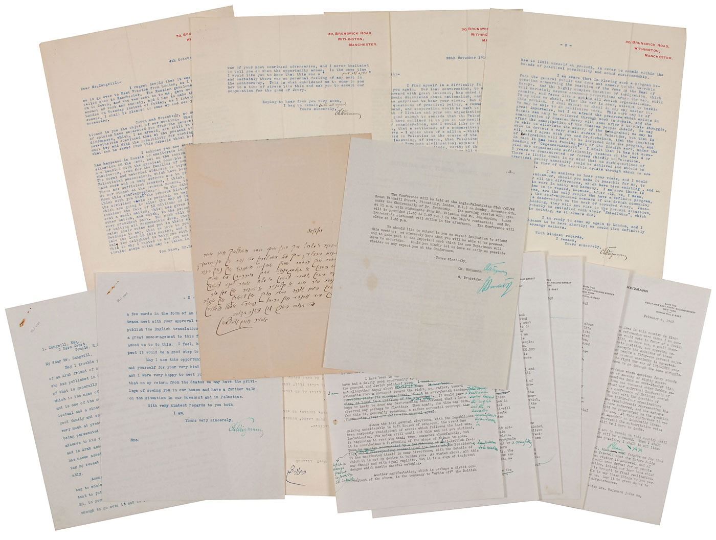 Jewish chemist and statesman (1874–1952) who helped secure the Balfour Declaration of 1917, served as President of the World Zionist Organization, and became the first President of Israel. Archive of eight items consisting of seven letters in English and Hebrew (including one ALS) and one typed proclamation, ranging in date from 1914 to 1951 and totaling 20 pages on 19 sheets. Five are signed and one is hand-notated. The letters are written to notable figures Field Marshall Jan Christian Smuts, Moshe Sharett, Walter Ettinghausen, and Israel Zangwill, and are incredibly rich in content, including thoughts of Europe after World War I, the settlement of Jews in Palestine, and secret questions about the congress of Zionists and about the “advancement of our aims in Palestine.” Two letters to Zangwill are unsigned: one is a retained carbon copy and one is a two-page TLS bearing a stamped signature. The six-page letter to Smuts is also unsigned, but is heavily notated in Weizmann's hand. A selection of the letters follows: