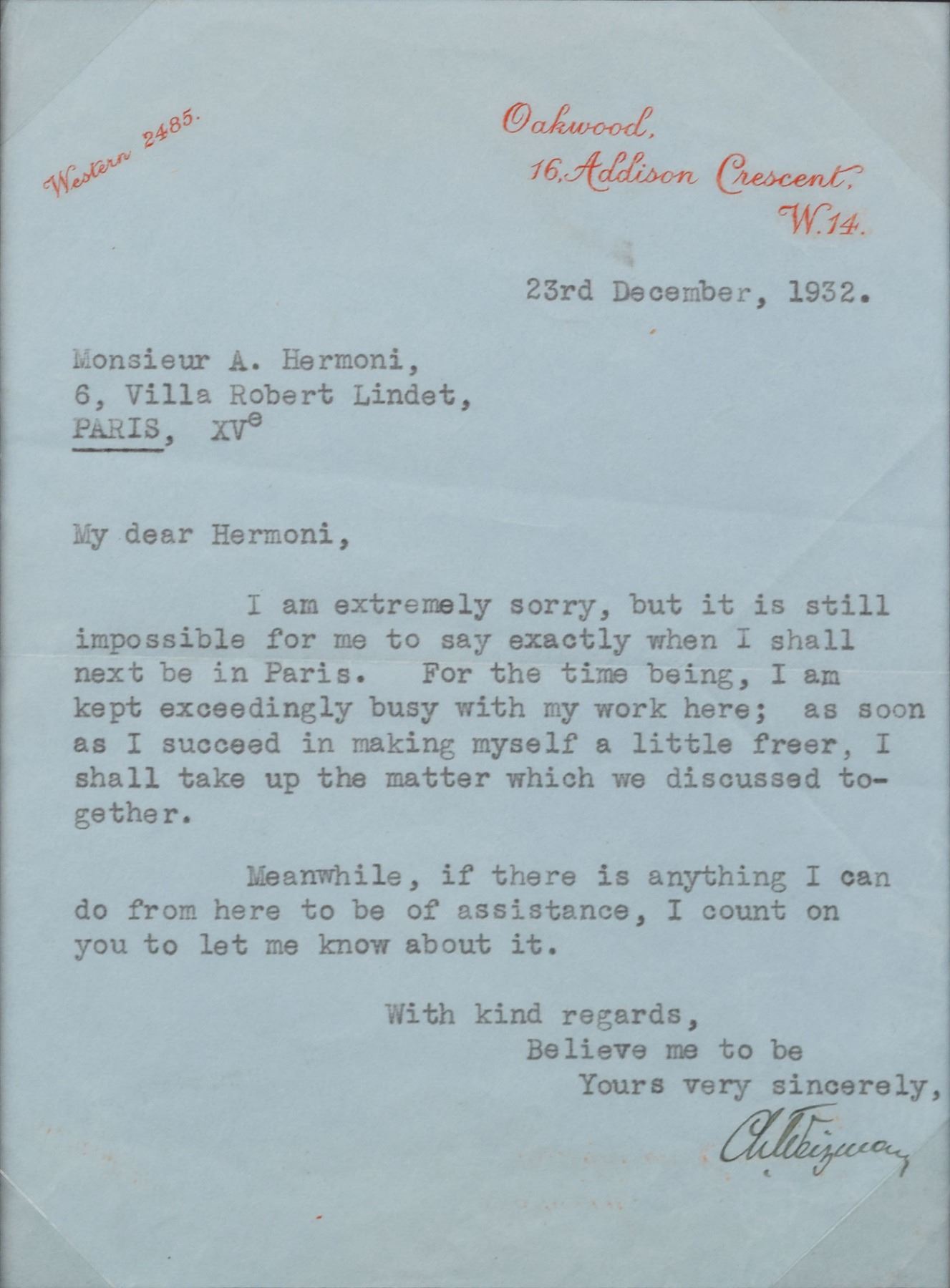 Jewish chemist and statesman (1874–1952) who helped secure the Balfour Declaration of 1917, served as President of the World Zionist Organization, and became the first President of Israel. TLS signed “Ch. Weizmann,” one page, 4.5 x 6.25, Oakwood letterhead, December 23, 1932. Letter to journalist Aron G. Hermoni in Paris, in part: "I am extremely sorry, but it is still impossible for me to say exactly when I shall next be in Paris. For the time being, I am kept exceedingly busy with my work here; as soon as I succeed in making myself a little freer, I shall take up the matter which we discussed together." Nicely matted and framed with a portrait to an overall size of 18 x 14. In fine condition.