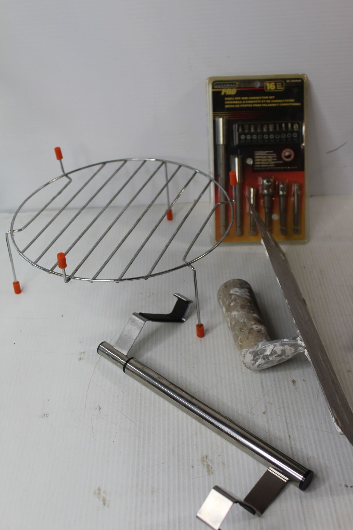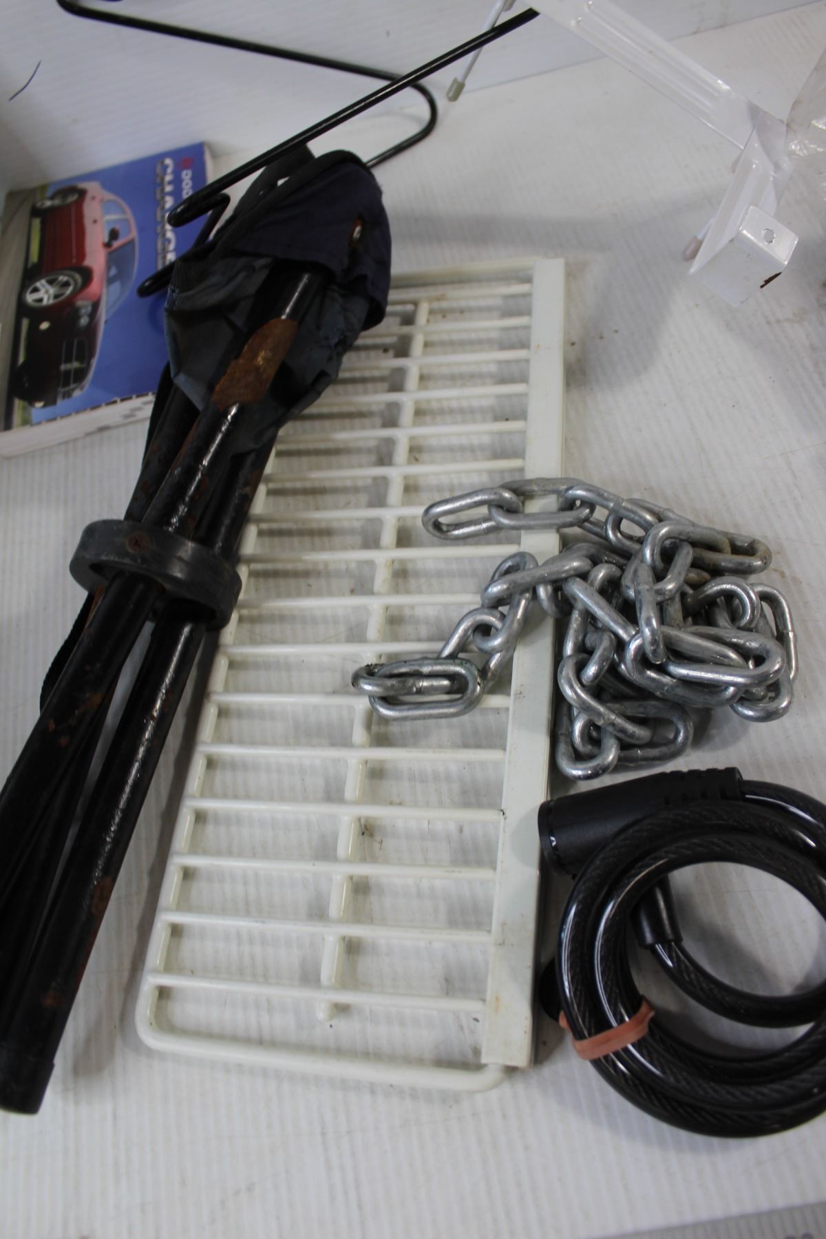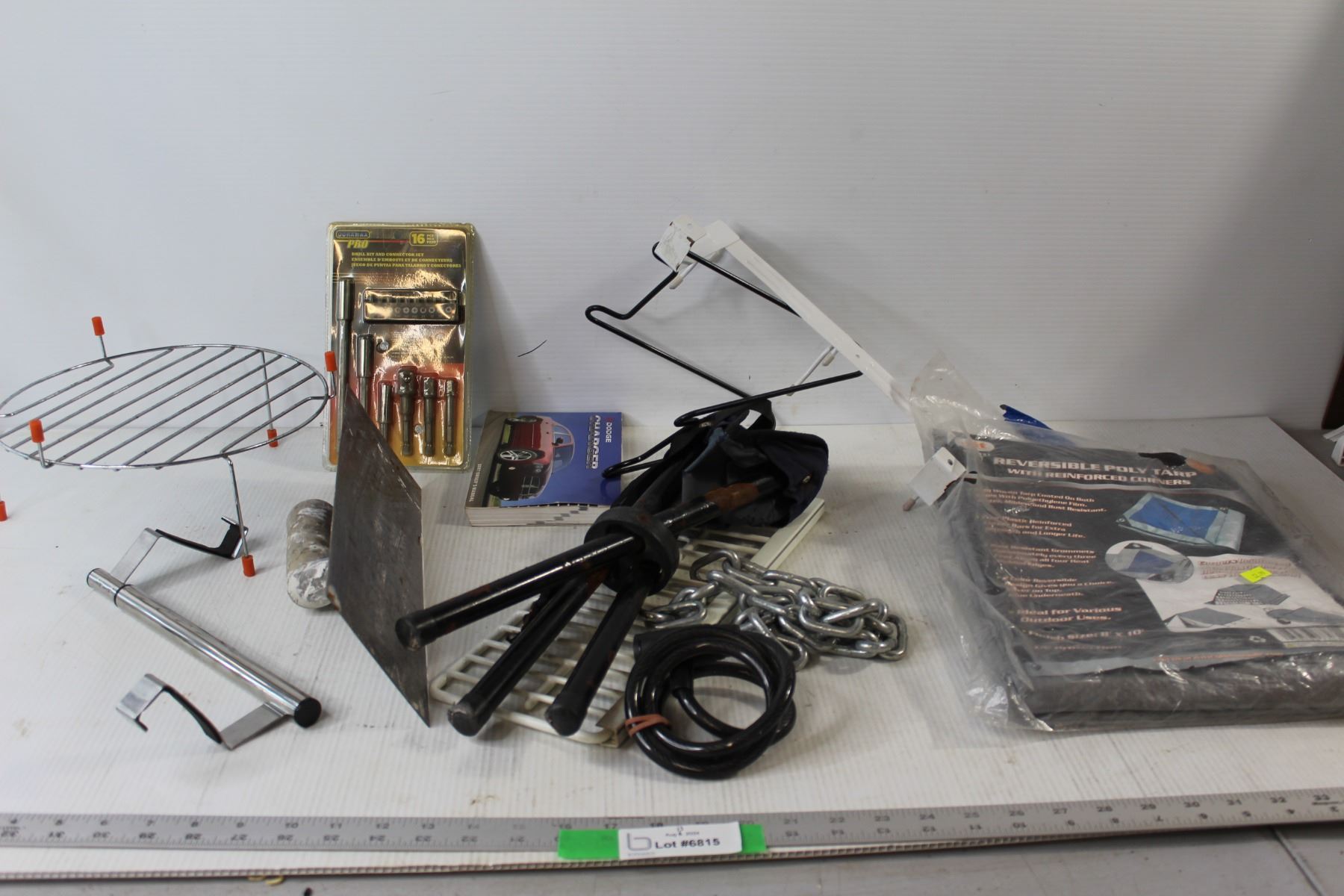 Chain, Bike Lock, Reversible Poly Tarp, Duramax Pro 16 pcs Drill Bit and Connector Set, Dodge Charger Manual, Assorted Home Improvement Tools
