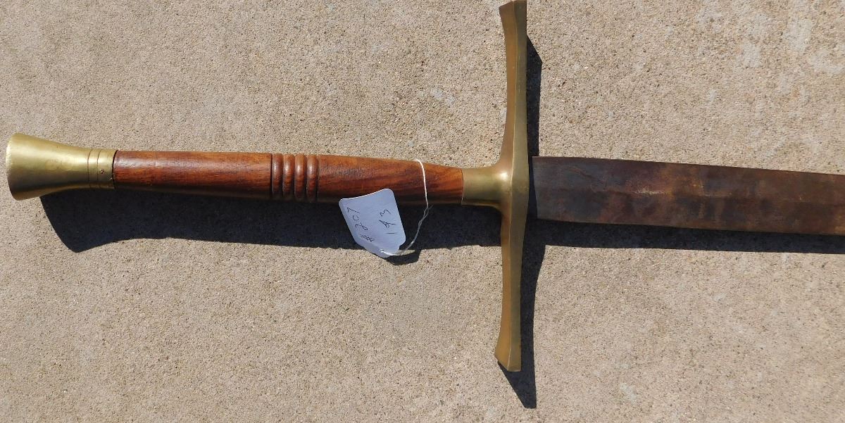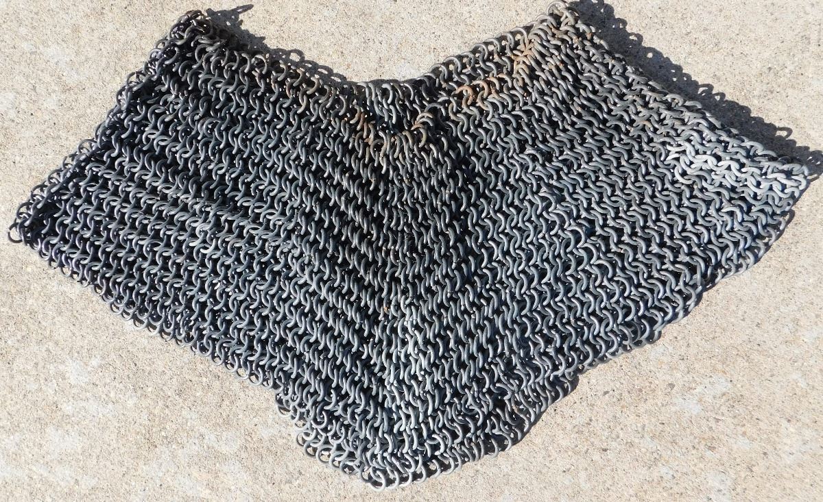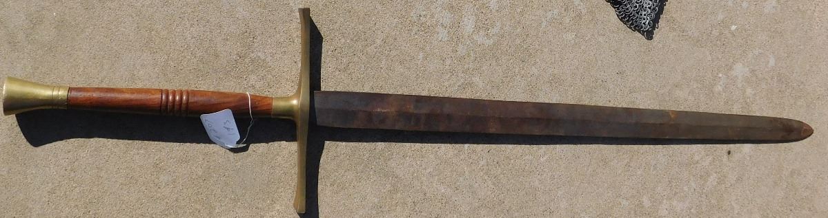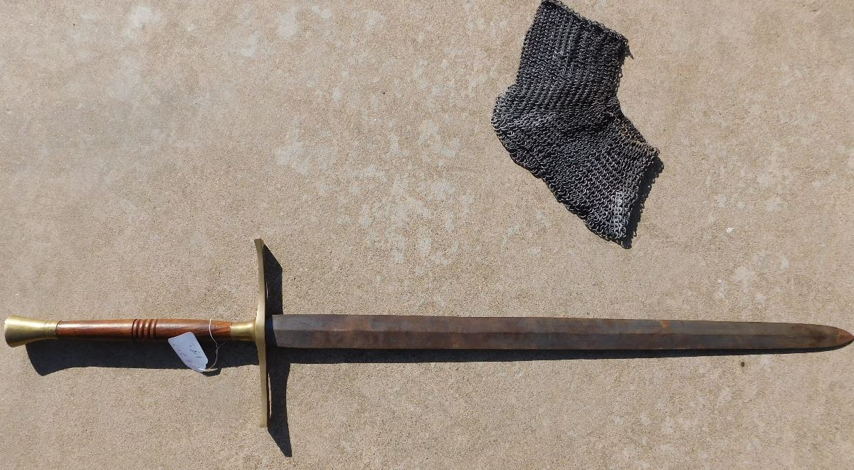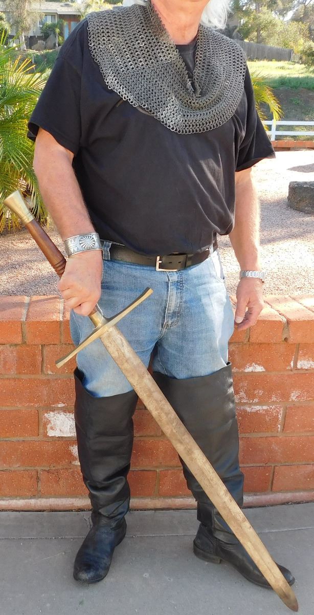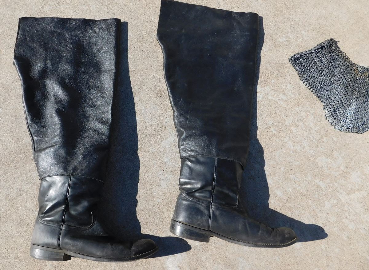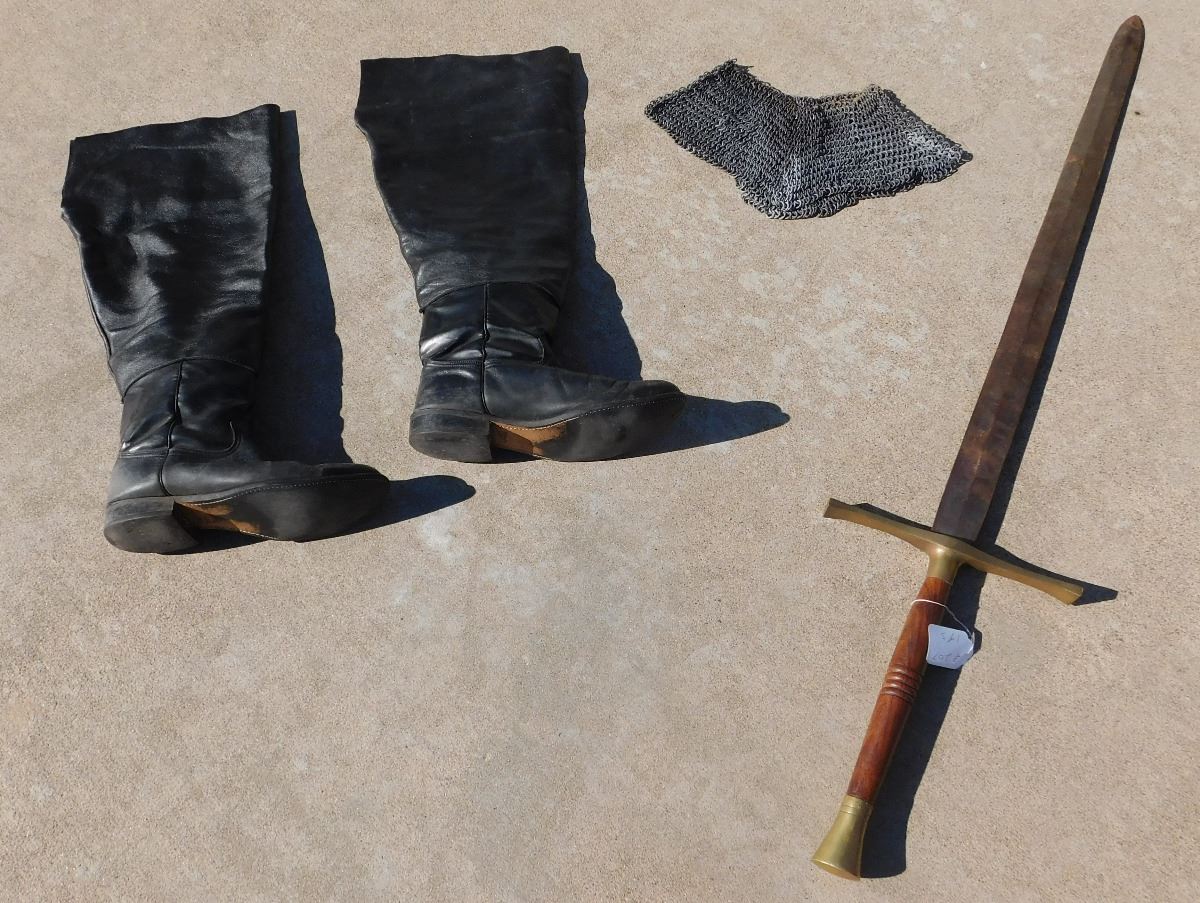 Chain Mail, Sword and Boot Set, circa 1950s. Lot contains steel, leather and wood. The sword is 53" long, boots are a size 12 and measure 27 inches tall, and chain mail. This collection is perfect for reenactments scenarios. Nice looking outfit with carbon steel, giant sword. Condition: Nice, see images. Shipping: $65.00.