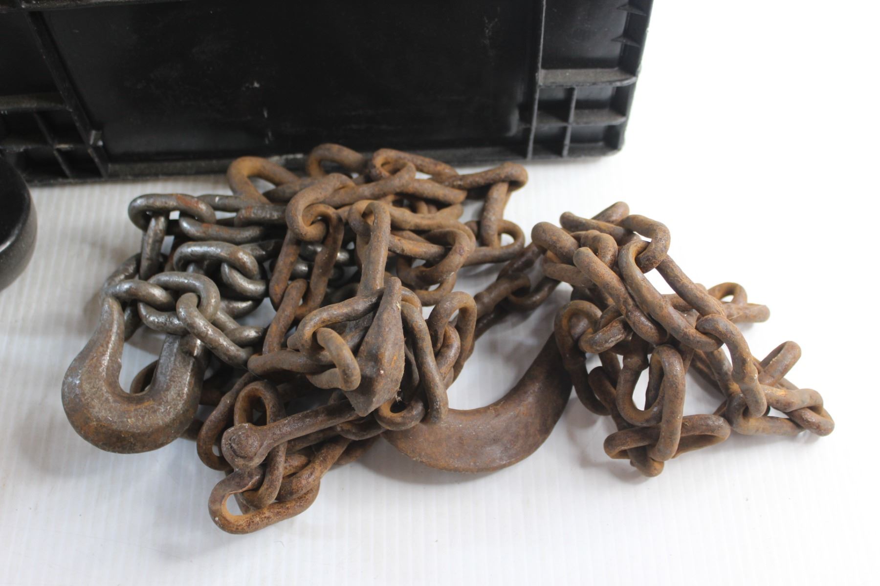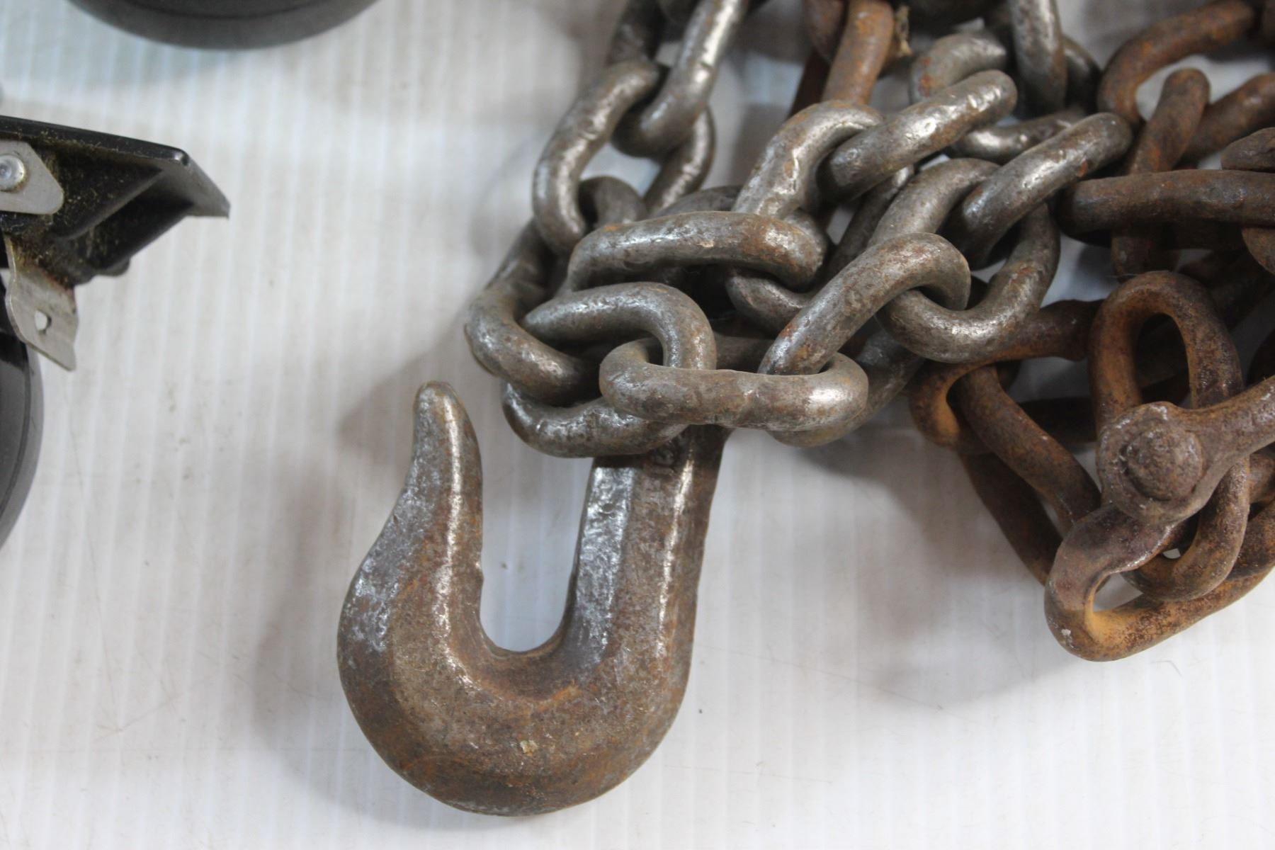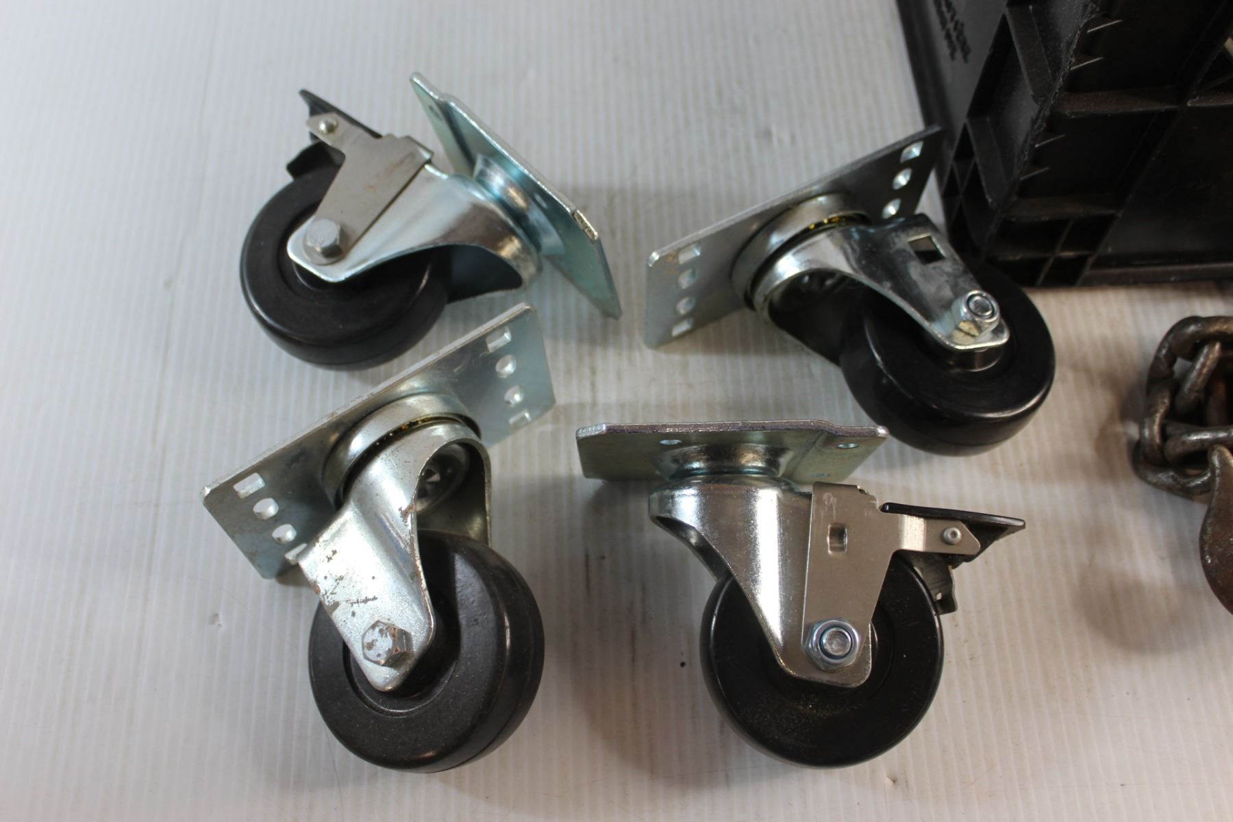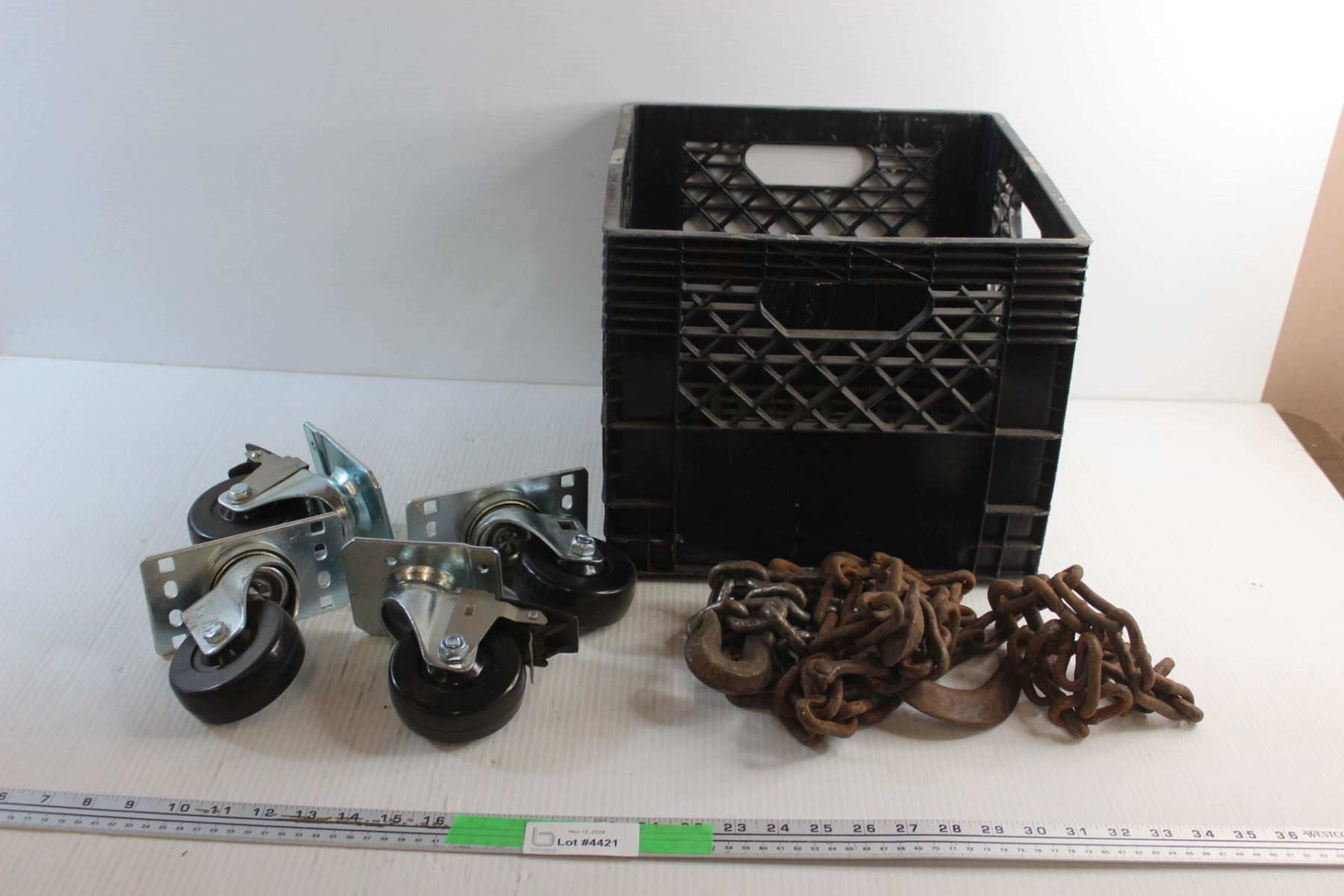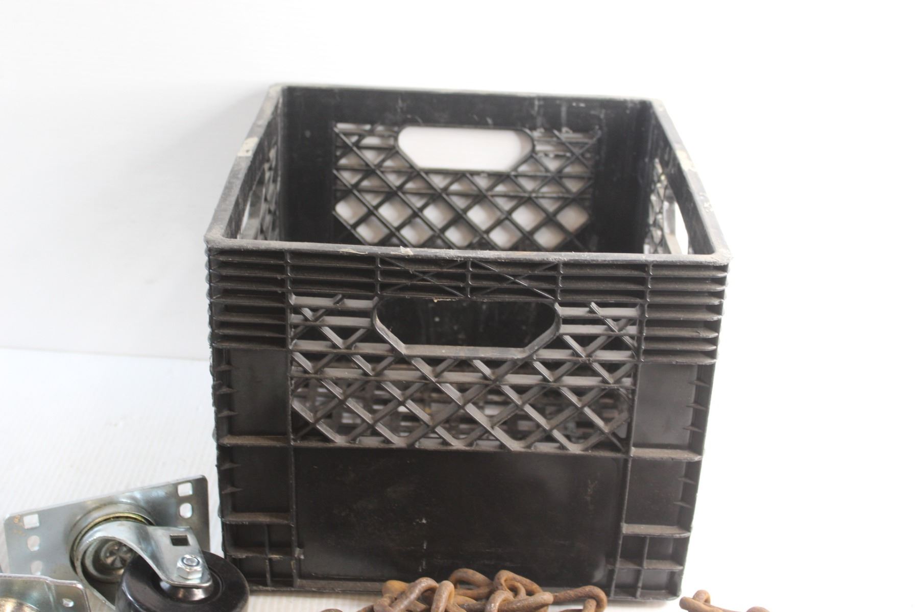 Chain with Hooks, (4) Caster Cart Wheels and a Plastic Crate