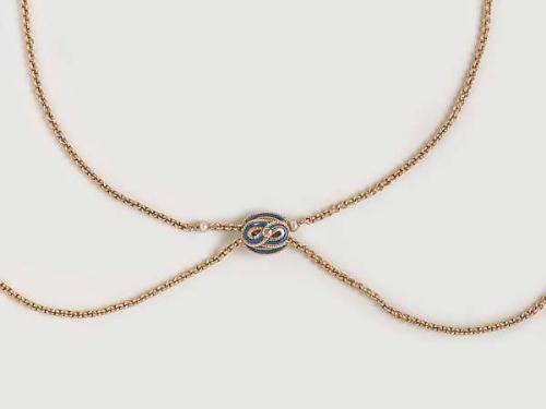 14 K gold, trace chain with 14 real pearls, blue enamelled clasp, original fitting, Vienna, circa 1900, marked, gross weight 24.7 g, length: 165 cm.