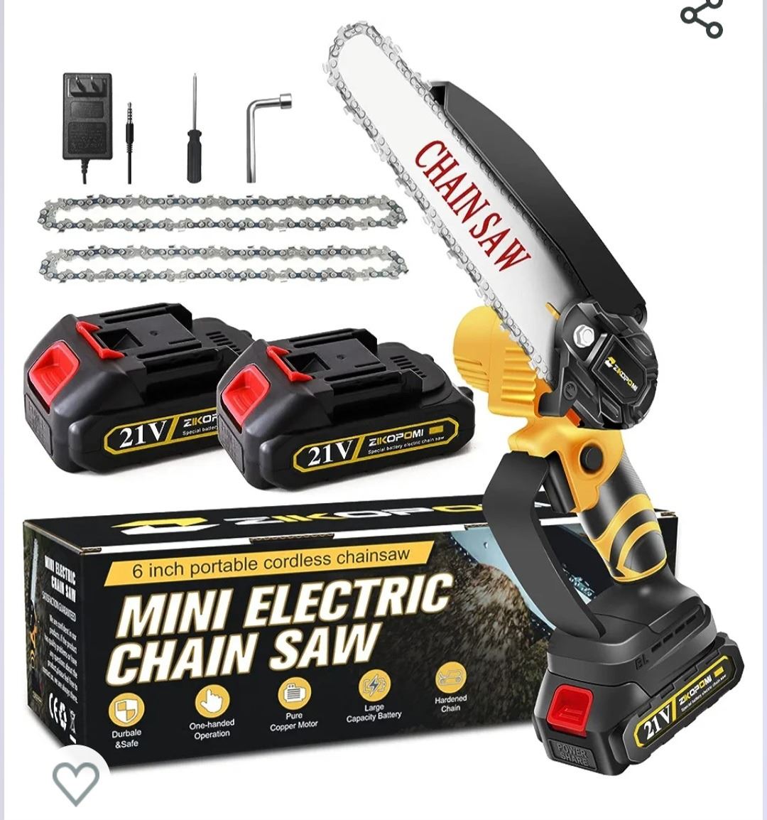 Zikopomi 6in portable mini electric chain saw, Includes 2 batteries, charger, extra chain, golves, glasses, and tools, New, picture shows 2 extra chains in this package there is only one