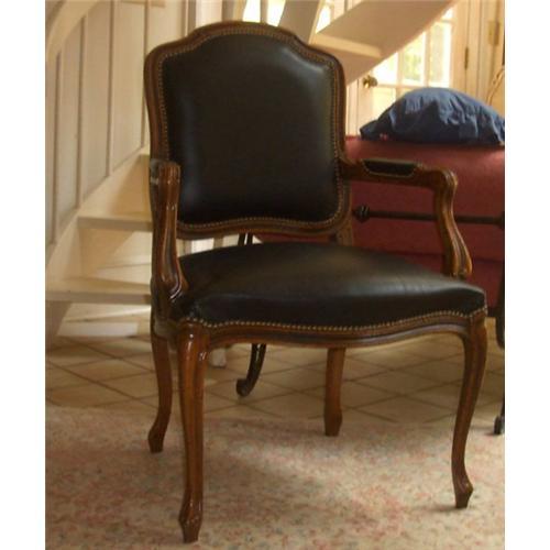 This lovely side chair is upholstered in a fine grade of black leather. The wood appears to be cherry. The height of the back is 39. The seat crowns at 20". The depth of the chair outside is