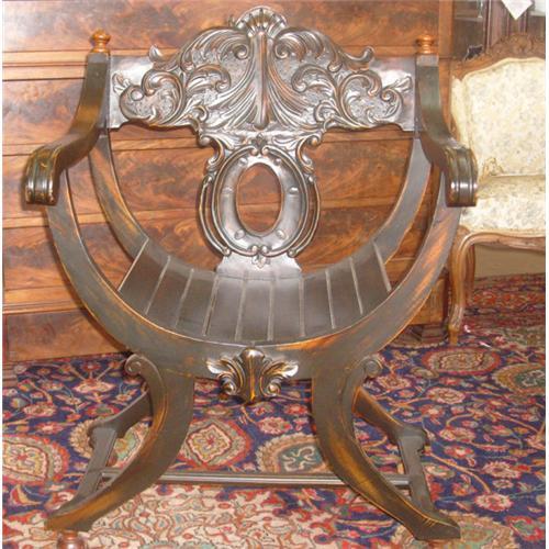 This is a late 20th century Savonarola style chair. The back is pierced and carved in deep relief with a foliate acanthus motif.