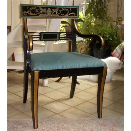 This lovely side chair has lovely handpainted griffins painted on the back panel. The fabric is a teal flame design. The background color is black with gold on the trim. It sits at 19". The back reaches up 36". The front across the seat measures 24" and the depth is 19". Old but studier than most side chairs. Thanks for looking.