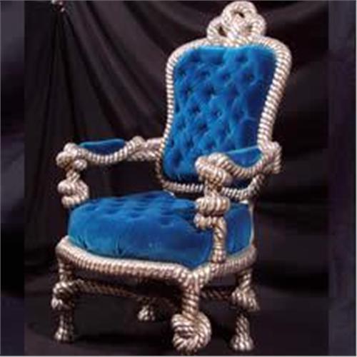 Sterling Silver "Kings Chair' the King of the house can sit in this heavy "love Knot" rope style throne. This is MICK FLEETWOODS chair.royal blue velvet hand tied springs teak base.Very Comfortable. Sterling Silver over hand carved wood.