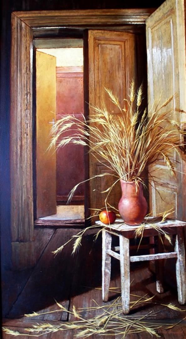 Chair & Wheat by Dimitri Annenkov features a red vase full of wheat next to a sunshine filled doorway. Framed original oil on canvas sixed at 47 1/2" x 30'.