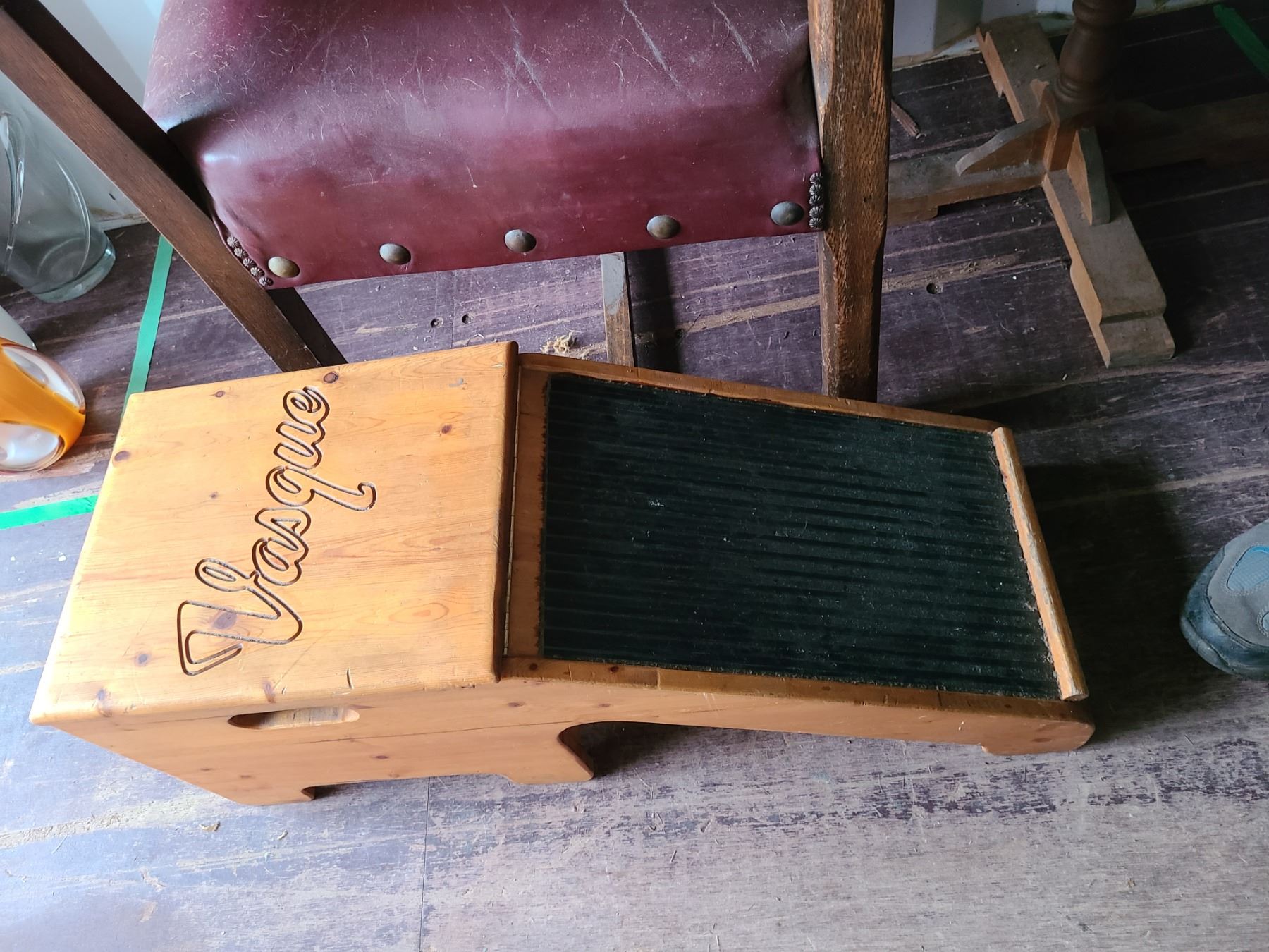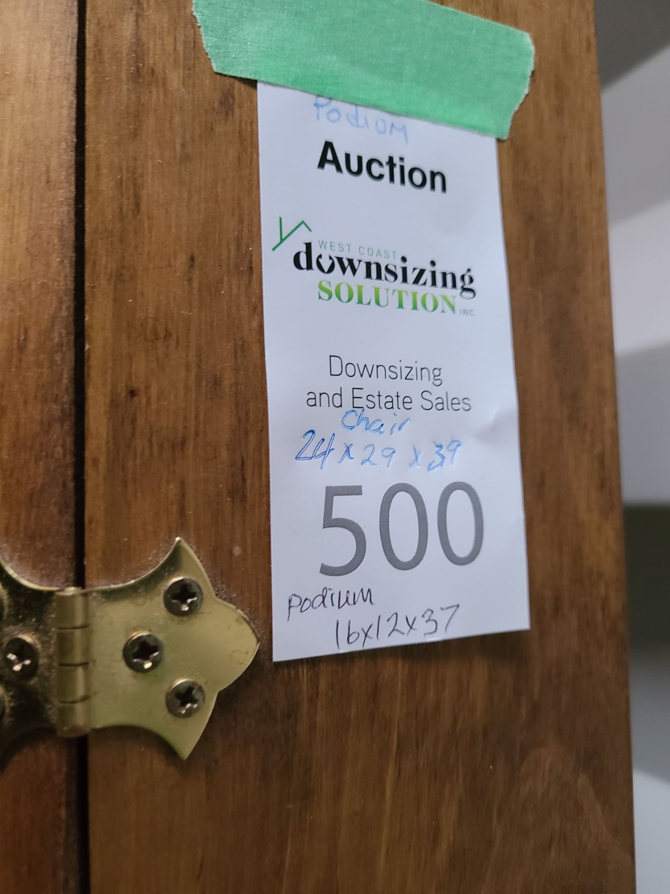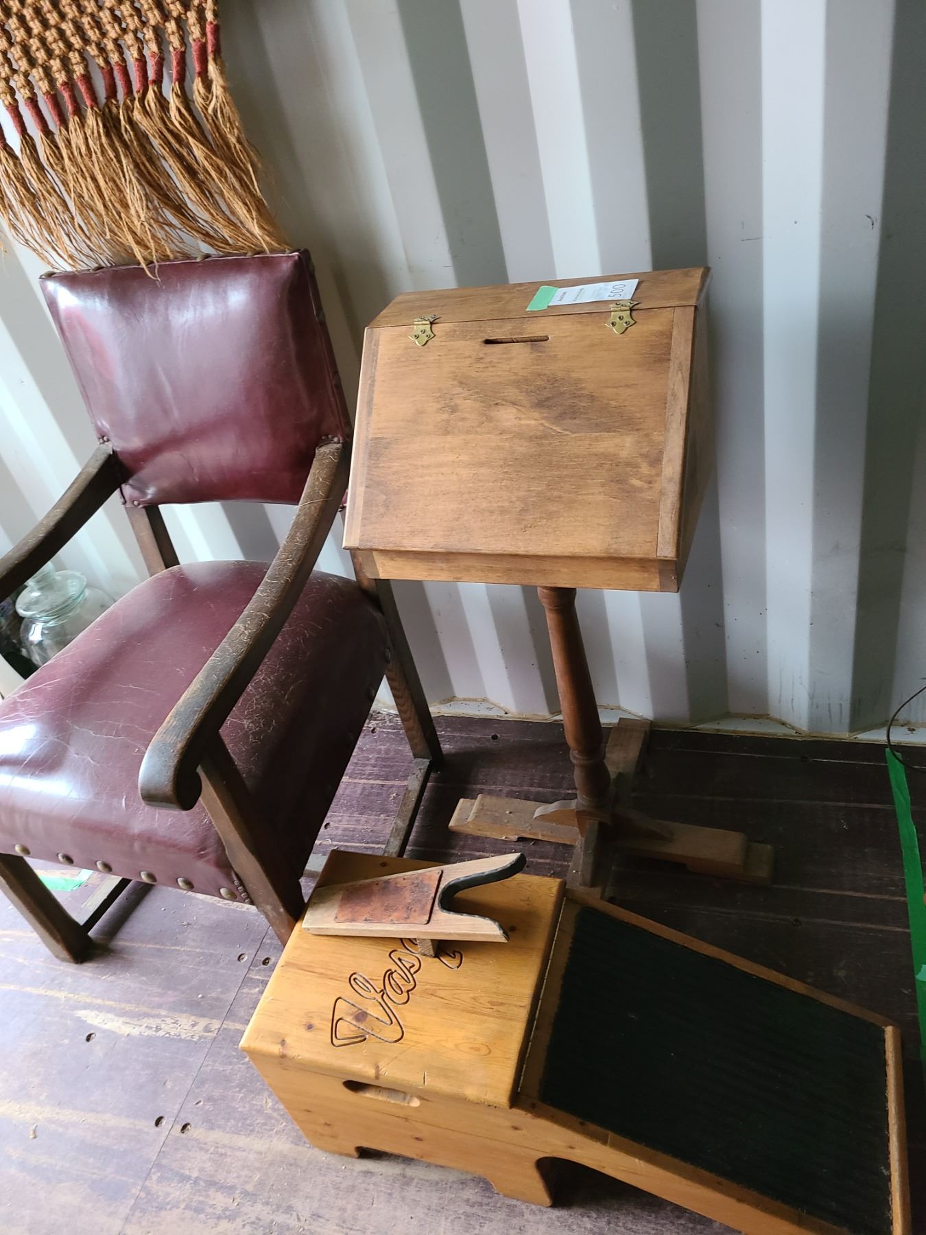 Large wood chair with leather 24x29x39, podium 16x12x37 and Vasque shoe shine stand. Pickup at 11 am.