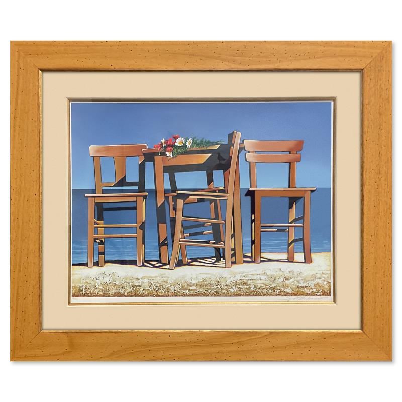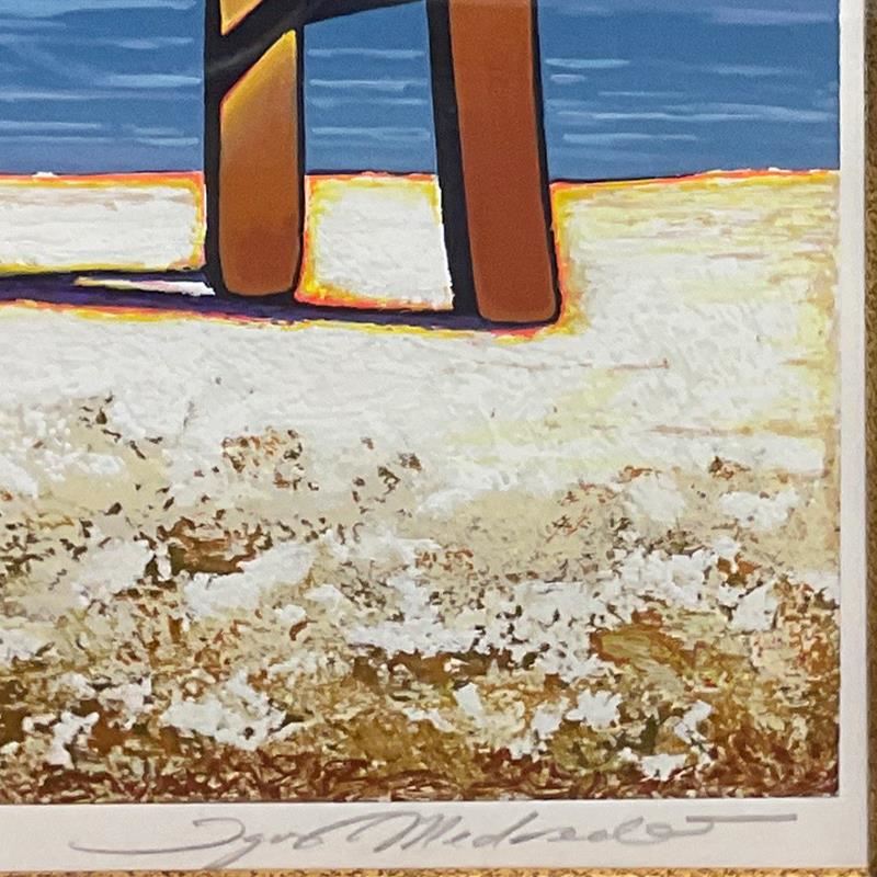 "Chairs and Flowers on Beach" is a limited edition serigraph on paper by Igor Medvedev, numbered 18/295 and hand signed by the artist. This piece comes framed. Includes Letter of Authenticity. Measures approx. 39.5" x 46.5" (frame), 23.5" x 32" (image). There is some wear on the frame.