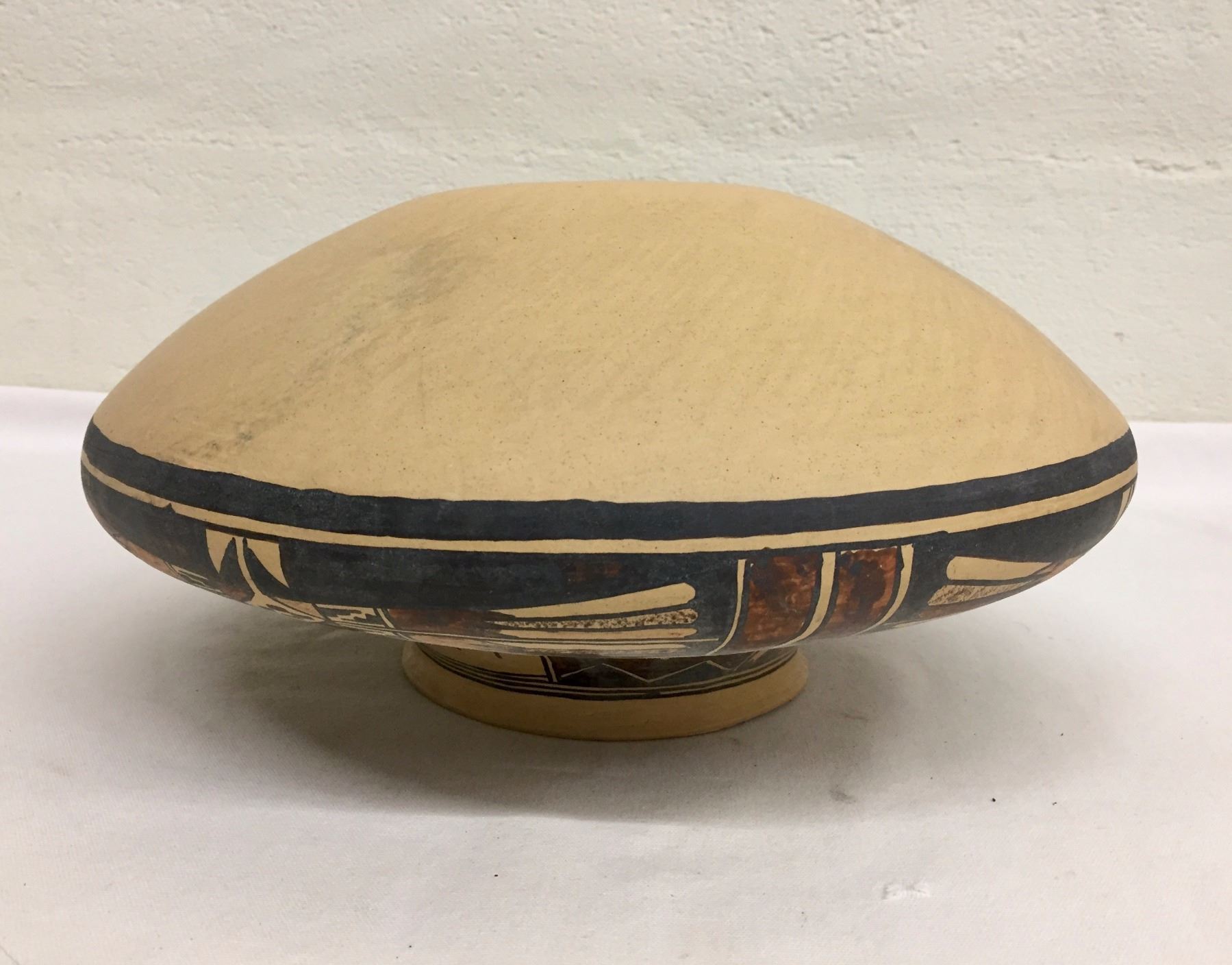 Description: A nice, “Chakoptewa” pot by Michael Hawley, a very well-known potter who was adopted into the Hopi tribe. Maker: Michael Hawley (1948-2012). Approx. Age: Fairly modern. Size: Approx. 13-1/2” w x 7” deep. Condition: Good for its age, normal wear expected. Please look closely at the pictures - they are an important part of our description. Shipping: There will be a $10 handling / packaging fee for shipping this lot. The actual cost of postage will be added on top of that.