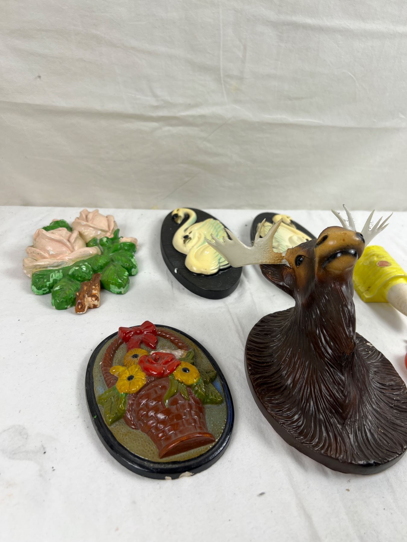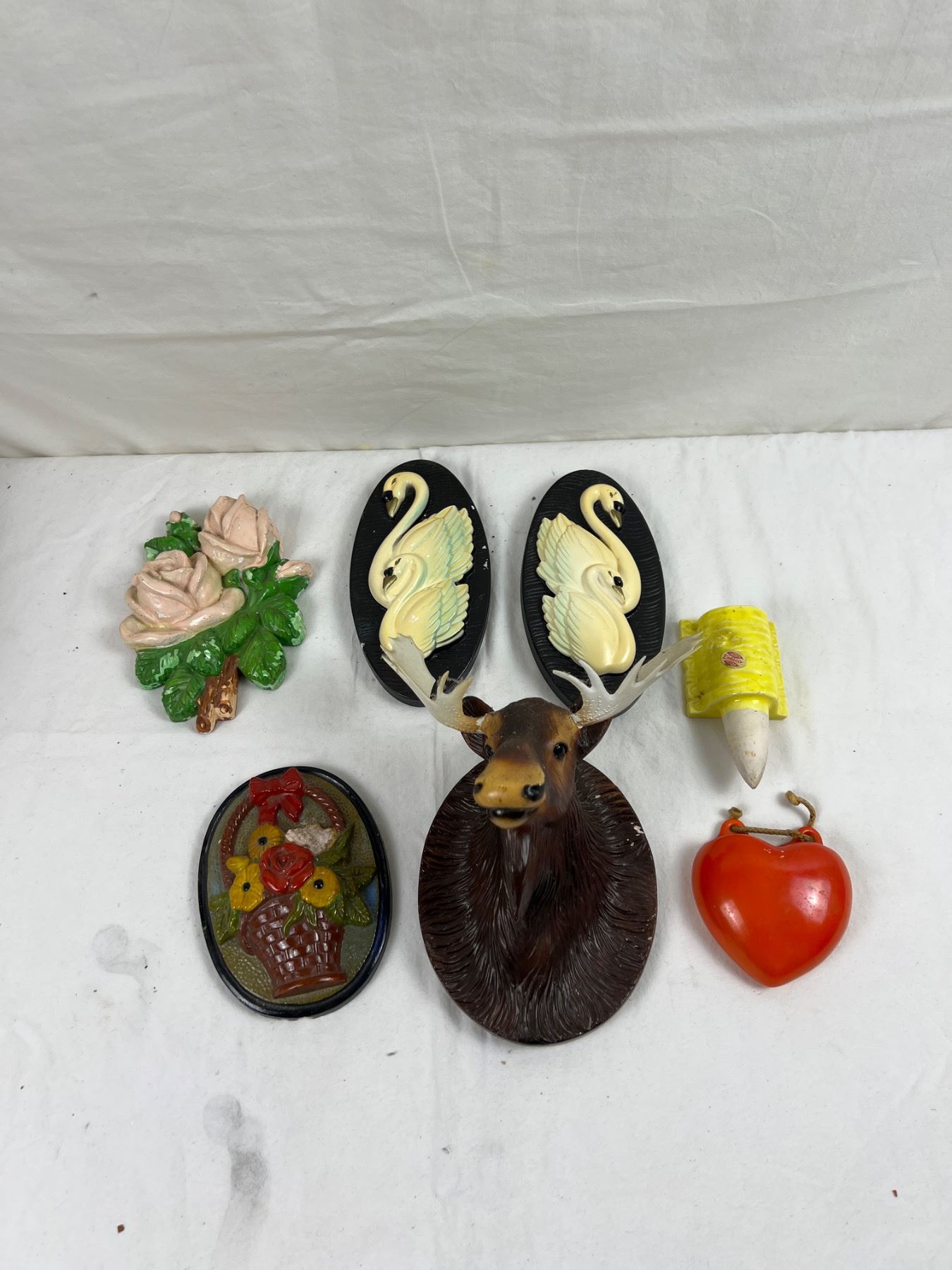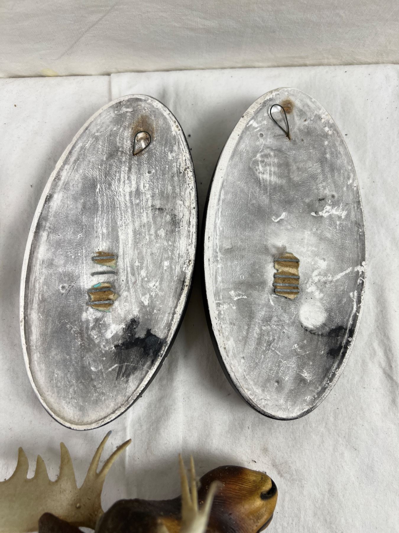Largest piece is moose who measures 8" wide and will stick approximately 6" off the wall. Some chips and paint wear.