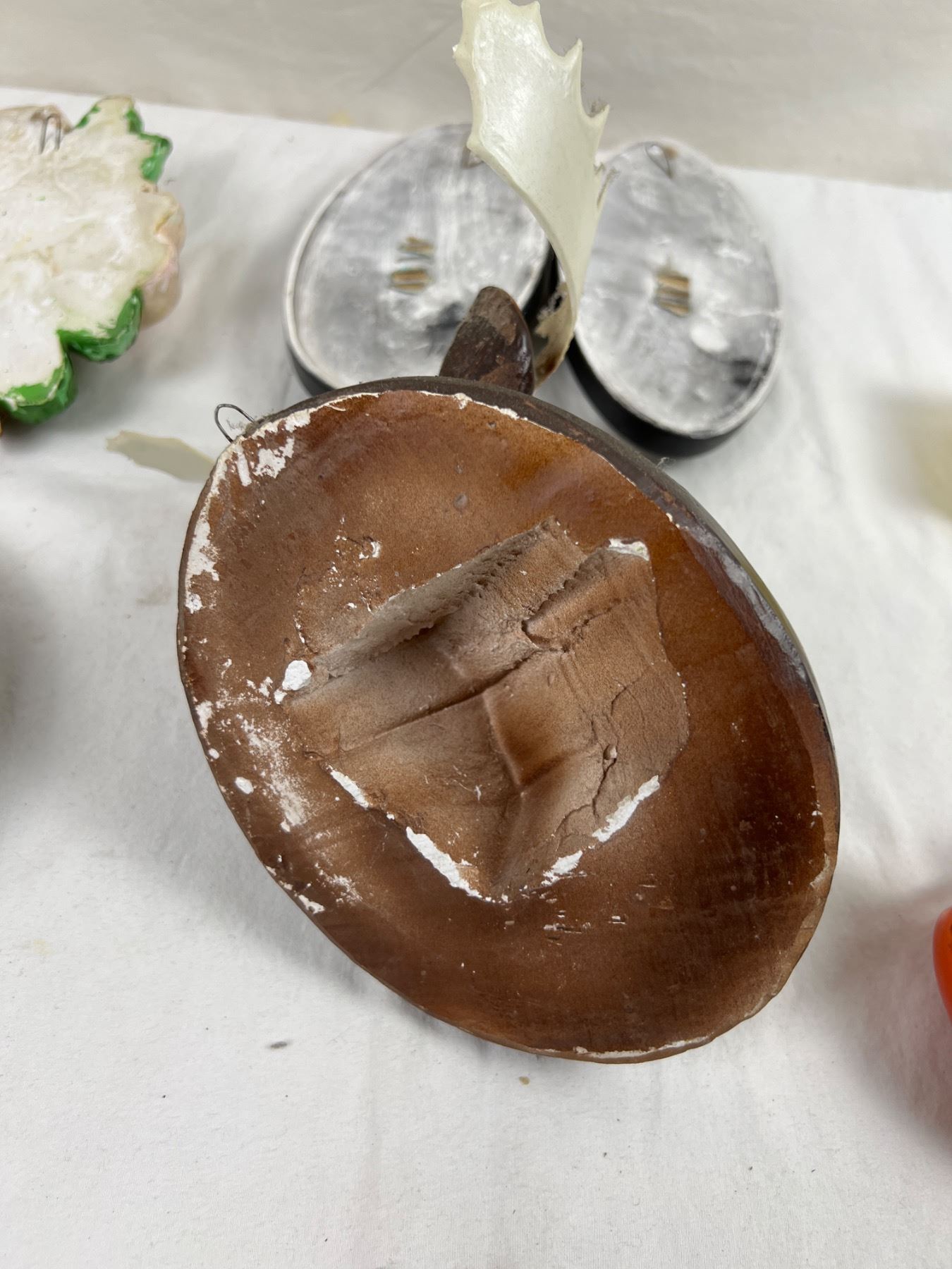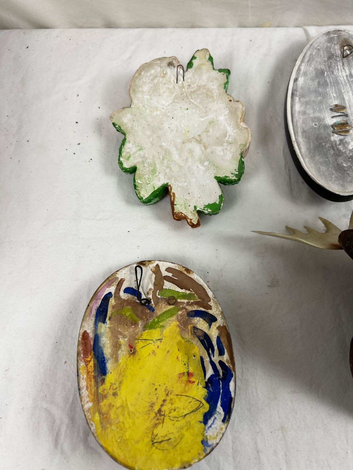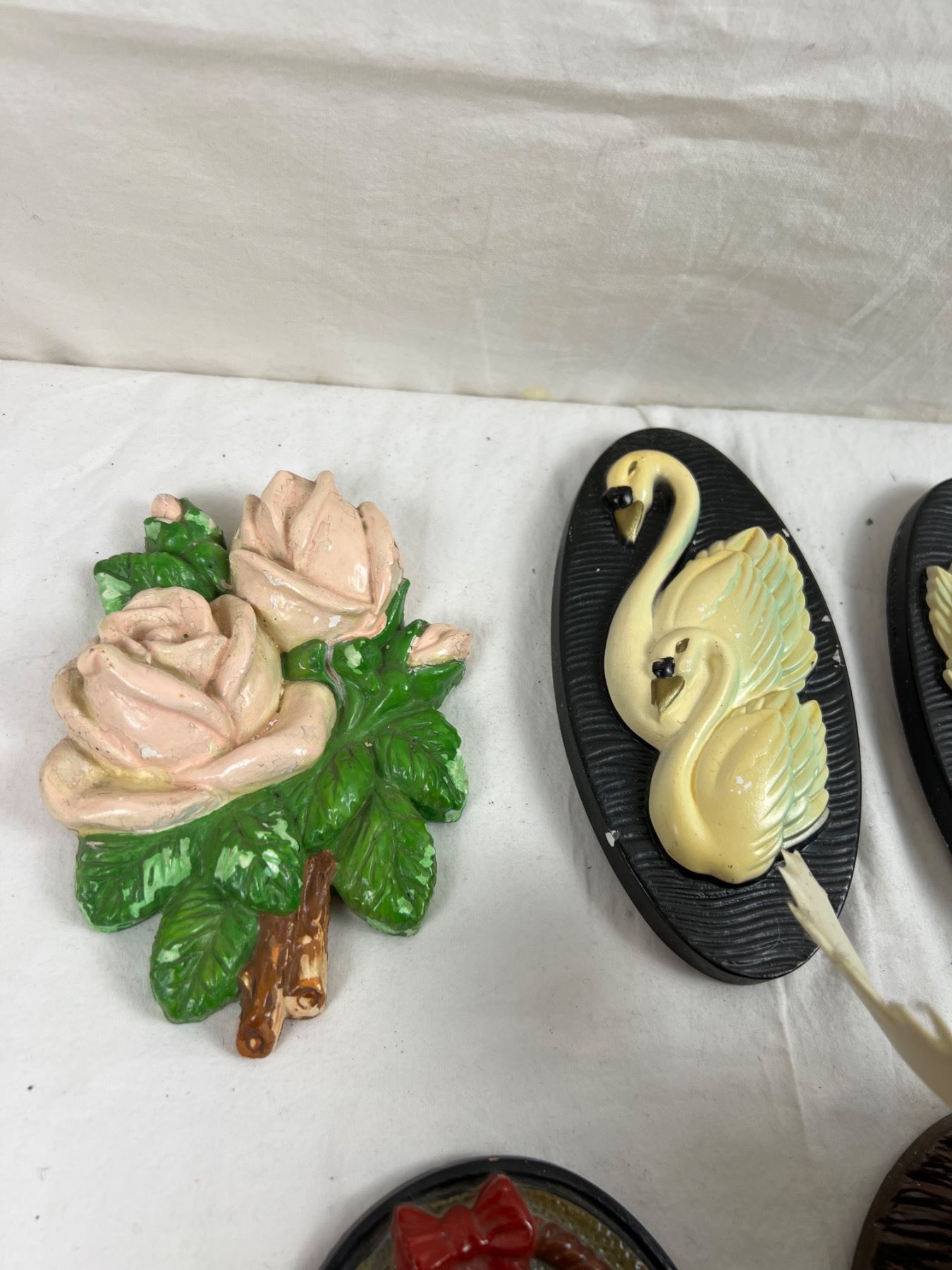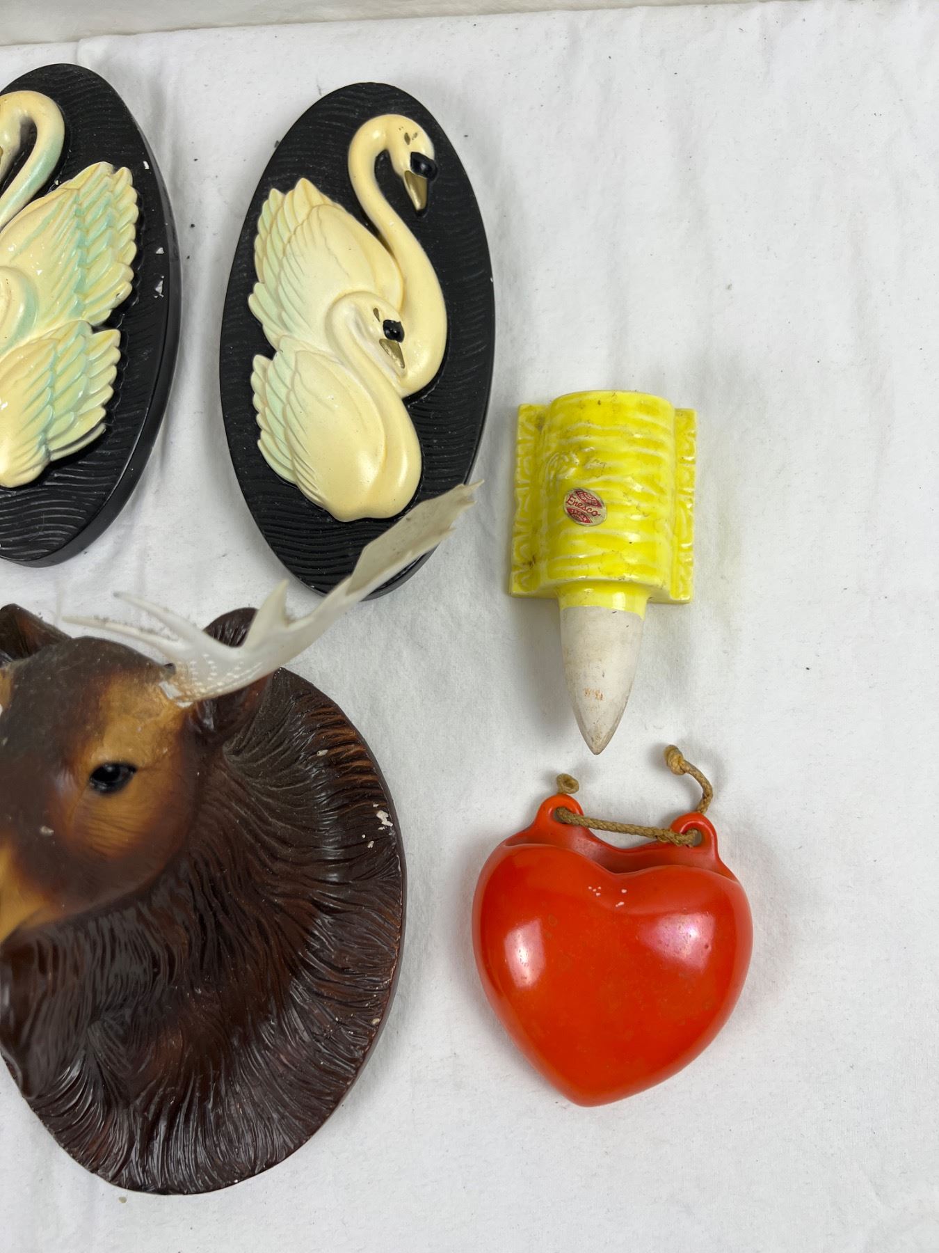 Largest piece is moose who measures 8" wide and will stick approximately 6" off the wall. Some chips and paint wear.