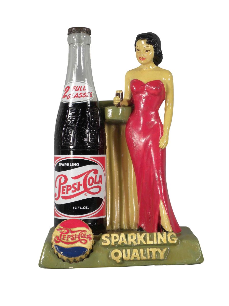 Chalk Pepsi Cola Store Display, entitled "Sparkling Quality". Comes with a later Pepsi bottle. Made by Plasto Mfg. Company, Chicago. Some paint loss on her back and back of display otherwise very good condition. 7 X 11 X 3 3/4 inches.