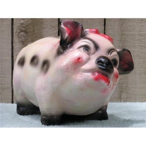 Isn't she lovely? This happy little piggy is just waiting to "wee wee wee" all the way to your home. It's very hard to find chalkware in this condition. Some very minor wear to her paint and a few small (extremely small) chips here and there are all that seperate this pig from absolute perfection. She doesn't have a cork anymore, but at her age how many of us are perfect? Piggy is 11" long from her snout to tail and 6" tall to her back (8" if you measure to her ear). She weighs in at 4 lbs. and so is quite svelte for her species!!