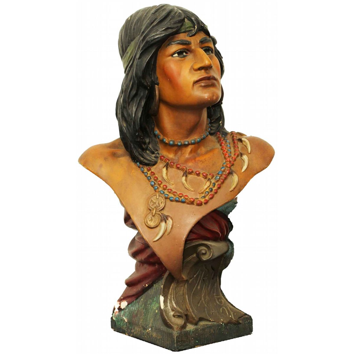 19th Century chalkware bust of Native American warrior, 20.5"Tx12"W. Signed on lower right.