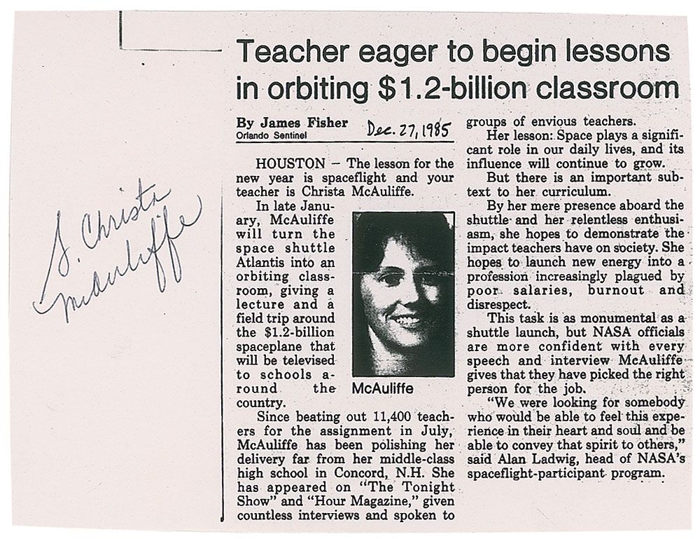 Photocopied newspaper article from the December 27, 1985, issue of the Orlando Sentinel, 6.5 x 5, signed in the blank left border in black ballpoint, “S. Christa McAuliffe.” In fine condition, with a central horizontal fold passing through a couple letters of signature.