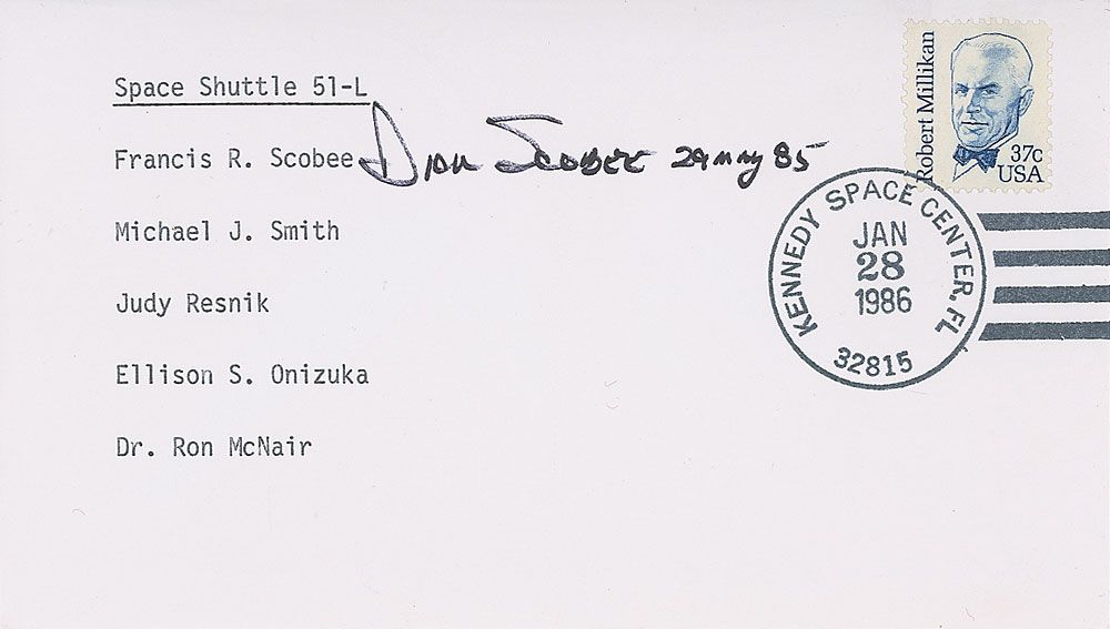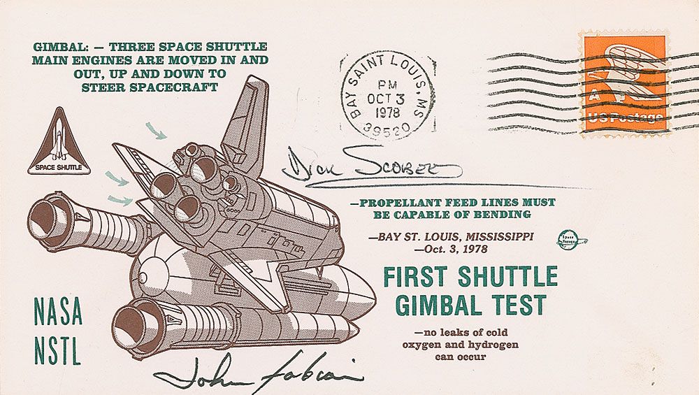 Two commemorative covers: one with a typed cachet honoring the ill-fated Space Shuttle 51-L, signed in black felt tip, “Dick Scobee, 29 May 85”; and one with a cachet honoring the first shuttle gimbal test, signed in black ballpoint and felt tip by Scobee and John Fabian. In overall fine condition.