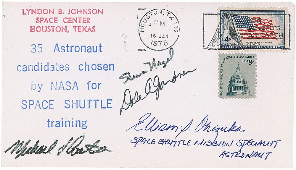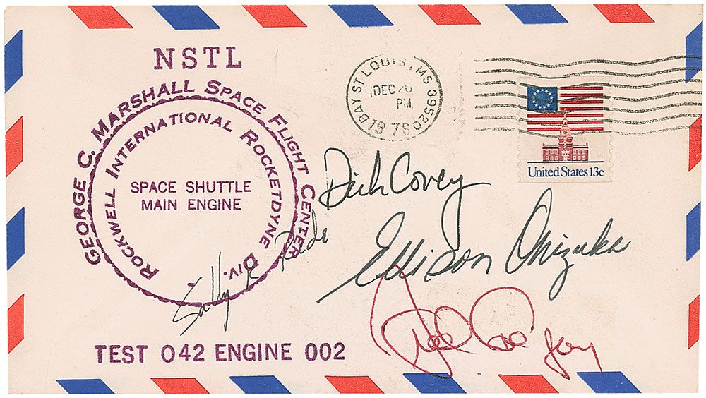 Two commemorative covers: one with a stamped cachet honoring astronaut training at the LBJ Space Center, signed in blue felt tip by Onizuka, “Ellison S. Onizuka, Space Shuttle Mission Specialist Astronaut,” and black felt tip by three others; and one with a stamped cachet honoring the space shuttle main engine, signed in felt tip and ballpoint by Onizuka, Sally Ride, and two others. In overall fine condition.