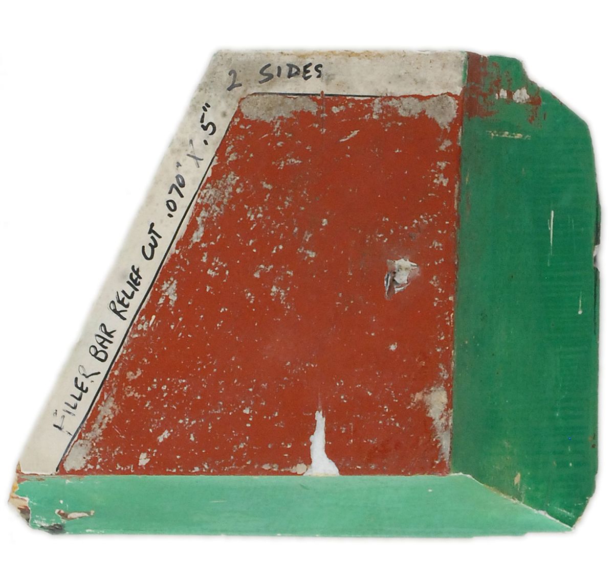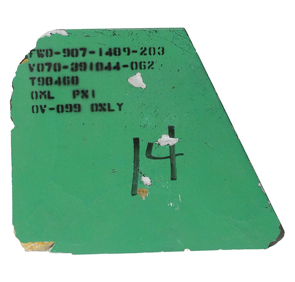 Available to US bidders only. Green angled shuttle fit check tile, used on the Challenger, 8.5 x 7.5 x 2.5, marked “V070-391044-062,” and “OV-099 Only,” with technician’s notations on the other side. Tile comes with a wooden display stand with an informational plaque affixed to the front. Before crews installed the actual reentry-enabling thermal heat shield, fit-check tiles were fabricated and installed on the orbiter's body. These ‘stand-in’ tiles were then referenced to manufacture their flight-ready counterparts. In very good condition, with several edge and surface chips, and scattered paint loss.