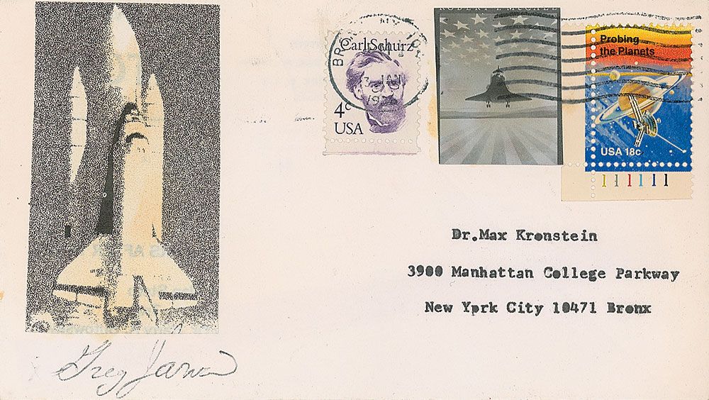 Mailing envelope, with an affixed printed photo of a shuttle launch affixed to left side, signed under the photo in black ballpoint by Jarvis. In fine condition. Accompanied by the original mailing envelope, with Jarvis’s typed return address in the upper left, and bearing a stamp that reads, “Shuttle ‘Challenger’ (Mission 51-L) Exploded on Take-Off Jan. 24, 1986.”