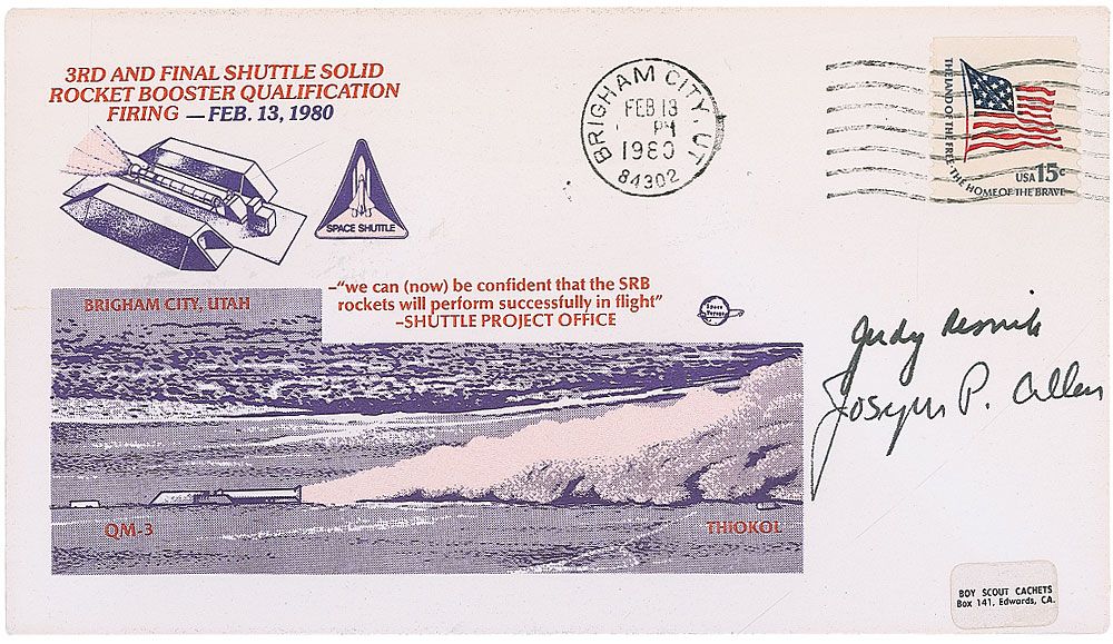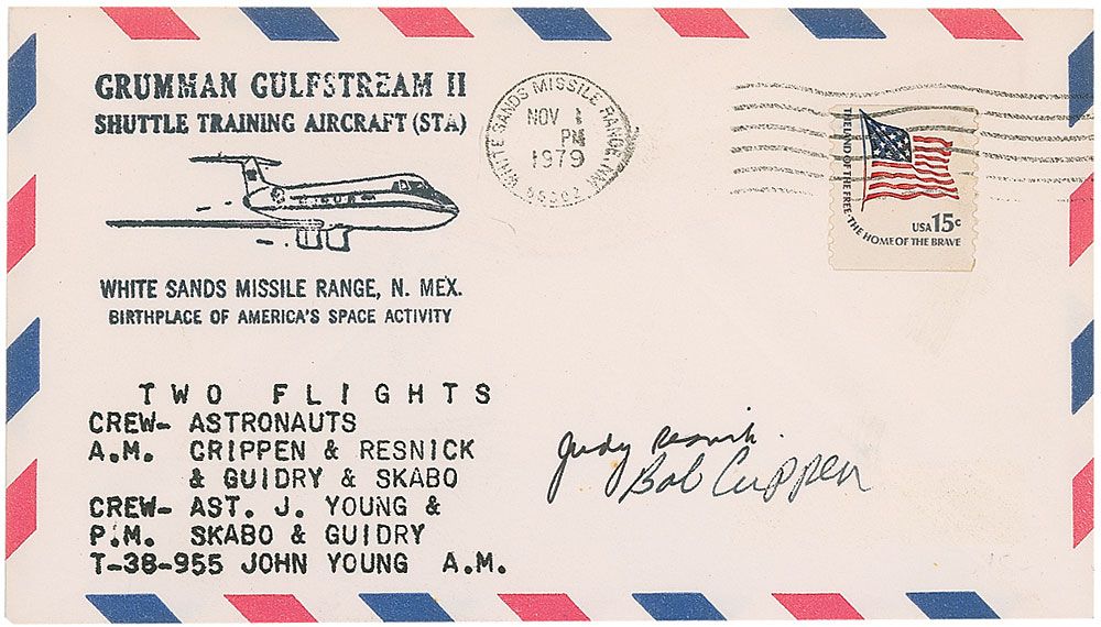 Two commemorative covers: one with a stamped cachet honoring the Grumman Gulfstream II, signed in black felt tip by Judy Resnick and Bob Crippen; and one with a cachet honoring the third Shuttle Solid Rocket Booster firing, signed in black felt tip by Judy Resnick and Joseph P. Allen. In overall fine condition.