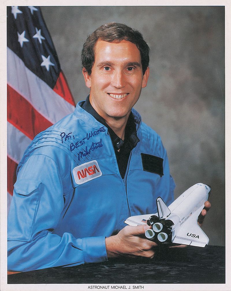 Color 8 x 10 NASA photo of Smith holding a shuttle model, signed and inscribed in blue felt tip “Pat, Best wishes, Mike Smith.” In fine condition, with a bit of trivial corner wear.