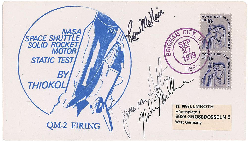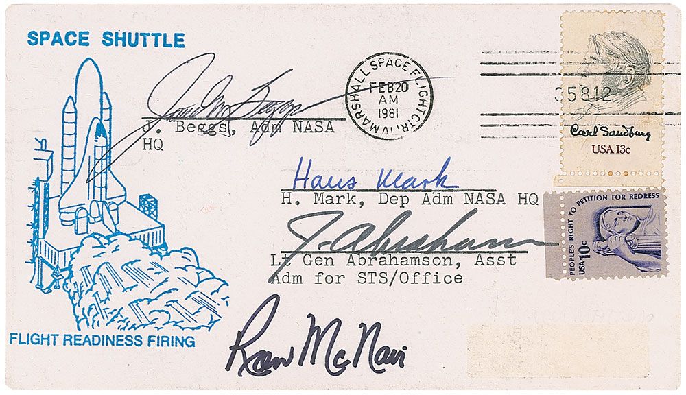 Two commemorative covers: one with a stamped cachet honoring the space shuttle flight readiness firing, signed in felt tip and ballpoint by Ron McNair and three NASA officials; and one with a stamped cachet honoring the solid rocket motor test, signed in black felt tip and ballpoint by McNair and two others. In overall fine condition.