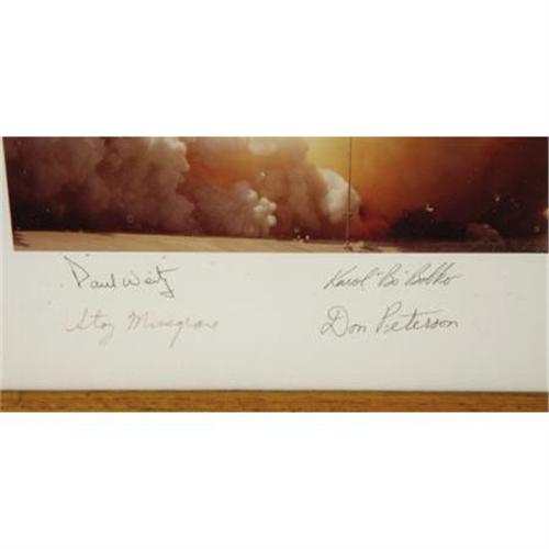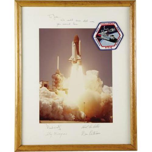 <B>Challenger STS-6 Large Signed Color Launch Photograph,</B></I> 10.5" x 13.5", matted to 15.5" x 19.5". Inscribed on mat "<I>To Joe -/ We could sure still use/ you around here./ Paul Weitz,</B></I>" also signed "<I>Story Musgrave,</B></I>" "<I>Karol 'B' Bobko,</B></I>" and "<I>Don Peterson.</B></I>" Musgrave signature a bit light. Framed with Challenger mission patch to 17.5" x 21.5". Fine condition. <I>From the collection of renowned former physical trainer of the astronauts Joe Garino. This lot is accompanied by a signed certificate of authentication from Garino verifying its provenance.</B></I><BR><BR><b>Shipping:</b> Framed - with Glass, Medium (<a target="_blank" href="http://www.heritageauctions.com/common/shipping.php">view shipping information</a>)