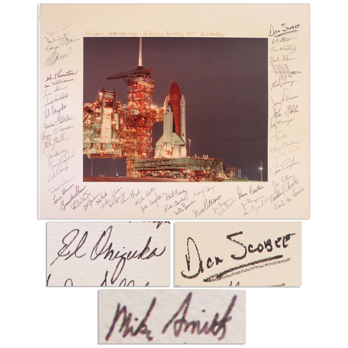 Nice NASA signed photo, with 53 signatures of shuttle astronauts and NASA personnel. Signatures are written in various shades of ink along the white mat. At the top border of mat reads: ''To Sam Samaniego -- A happy, healthy 70th Birthday''. Photo depicts an official NASA space shuttle in the evening sky at Cape Canaveral Station. Challenger crew-member signatures include: ''Dick Scobee'', ''Michael Smith'' and ''Ellison Onizuka''. Photo measures 13.5'' x 10.5'' and is matted to an overall size of 20'' x 16''. Near fine.
