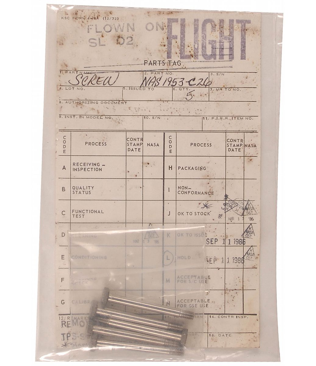 A packet of five bolts flown on Spacelab-2, carried on Challenger mission STS-51F. Packet is sealed in plastic, with a KSC 4-8A form filled out by a technician, stamped “Flight Flown on SL 02.”