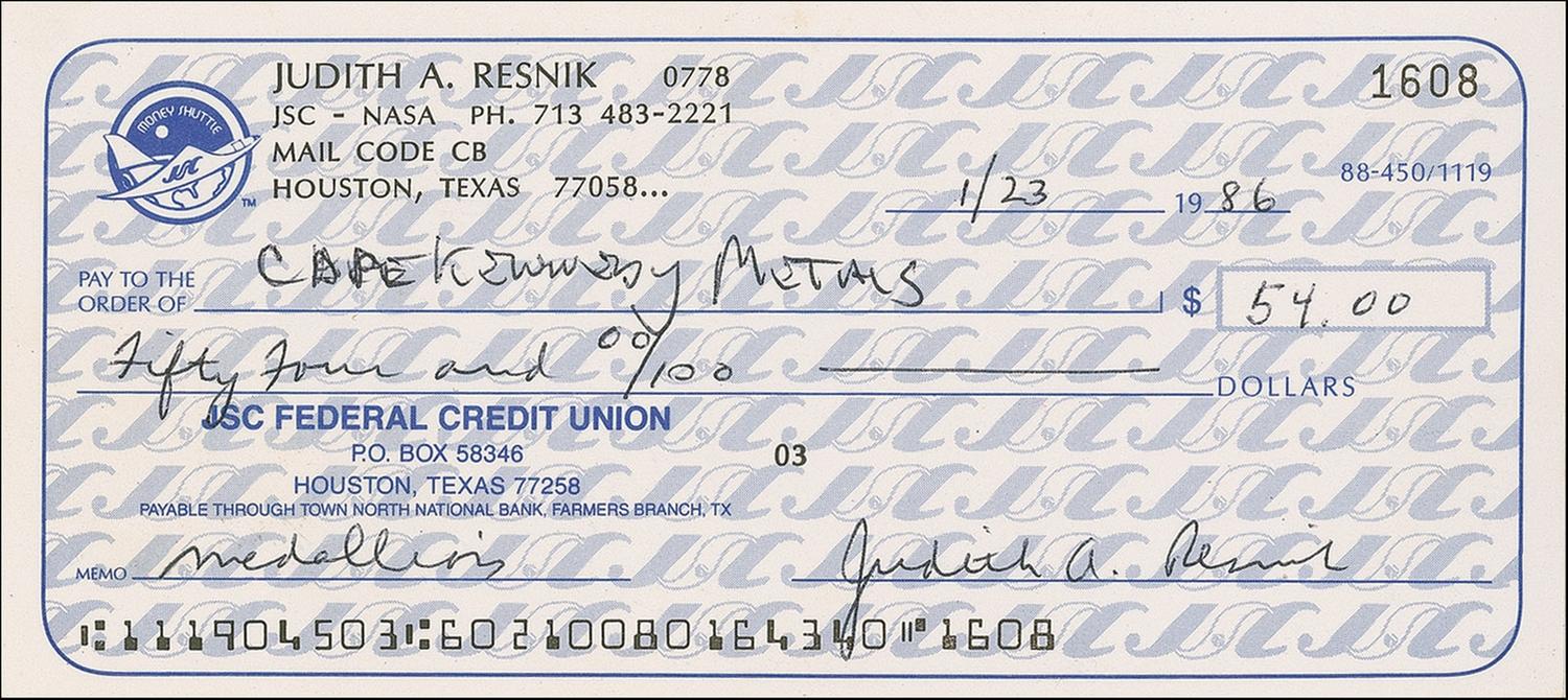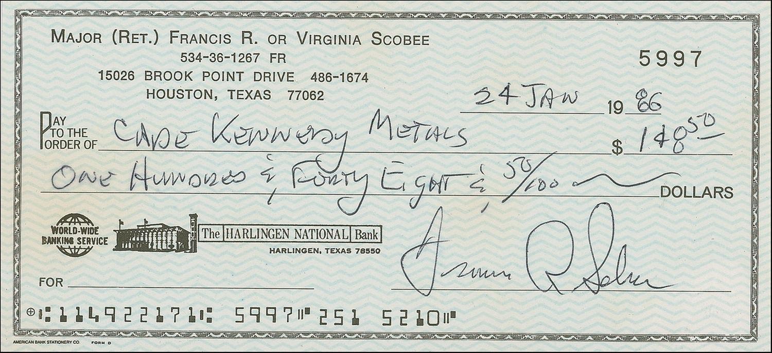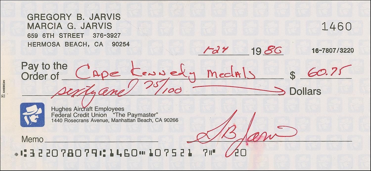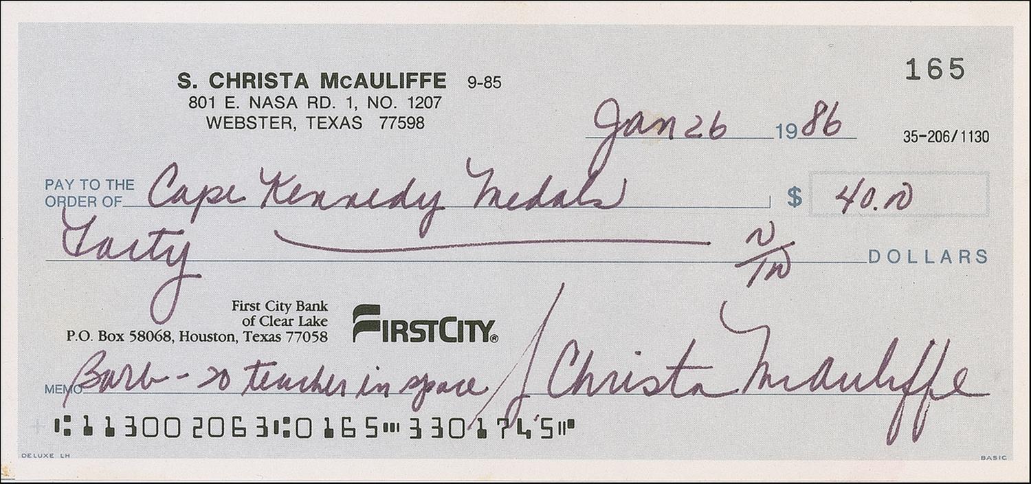 Cape Kennedy Medals was a Cocoa Beach, Florida, company that manufactured mission patches, medallions, pins, and other related souvenirs and memorabilia for shuttle crews. The Challenger crew ordered such mementos for their upcoming mission while in quarantine at crew quarters before their flight, with McAuliffe’s check dated just two days before the launch. (Her memo, “Barb-20 Teachers in Space,” likely means that her order was for twenty Teacher-in-Space souvenir patches for her back-up, Barbara Morgan, to distribute to certain people attending the Challenger launch. Morgan eventually went on to become a full-time NASA mission specialist astronaut and did fly in space many years later.) These checks very well may be the last known written bank drafts by the astronaut crew members.