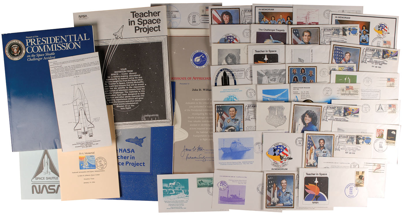 Collection of 38 items, almost all relating to the Challenger disaster. Items include: a blank Teacher in Space application packet; a Teacher in Space NASA fact sheet; 32 commemorative covers honoring the crew and mission; a program from the January 31, 1986, memorial; a copy of the Presidential Commission on the Space Shuttle Challenger Accident; a NASA landing parking pass; and a certificate of appreciation issued to John D. Williams in support of the accident investigation.