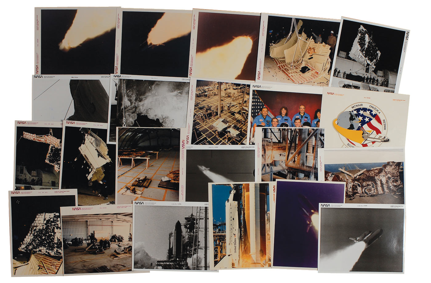 Twenty-two unsigned NASA photos, glossy and satin-finish, some ‘red-numbered’ most from the explosion and recovery effort after the Challenger disaster on January 28, 1986. In fine condition.
